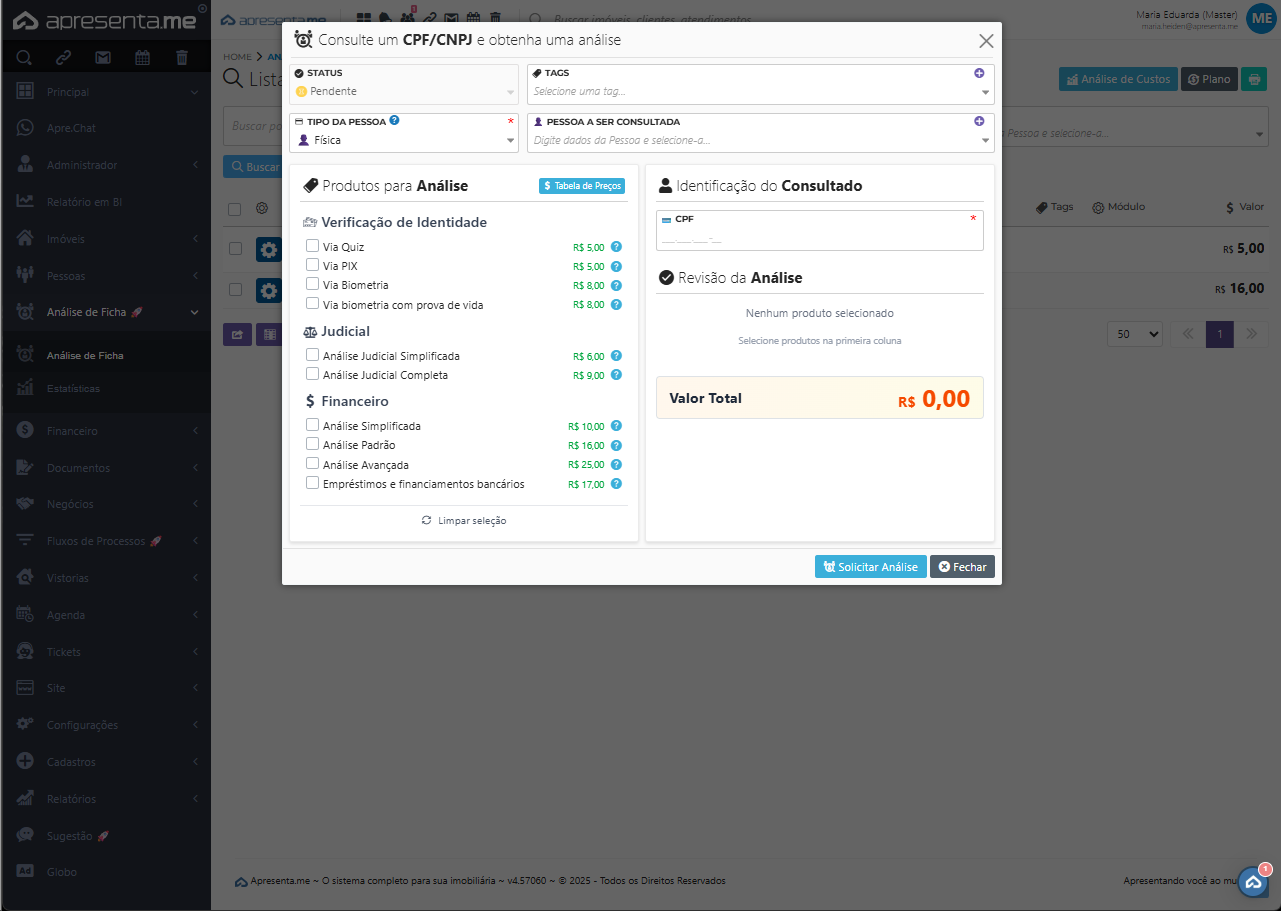 A funcionalidade de Análise de Ficha permite realizar consultas financeiras, de antifraude e de antecedentes judiciais. Com esses recursos, a imobiliária consegue avaliar o histórico do cliente, identificar possíveis riscos e tomar decisões mais seguras na conclusão de futuras negociações.