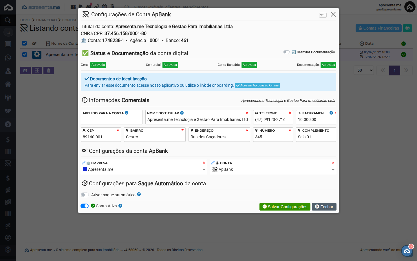 O modal de Configurações de Conta ApBank será aberto. Role o conteúdo até a seção Configurações para Saque Automático da Conta.