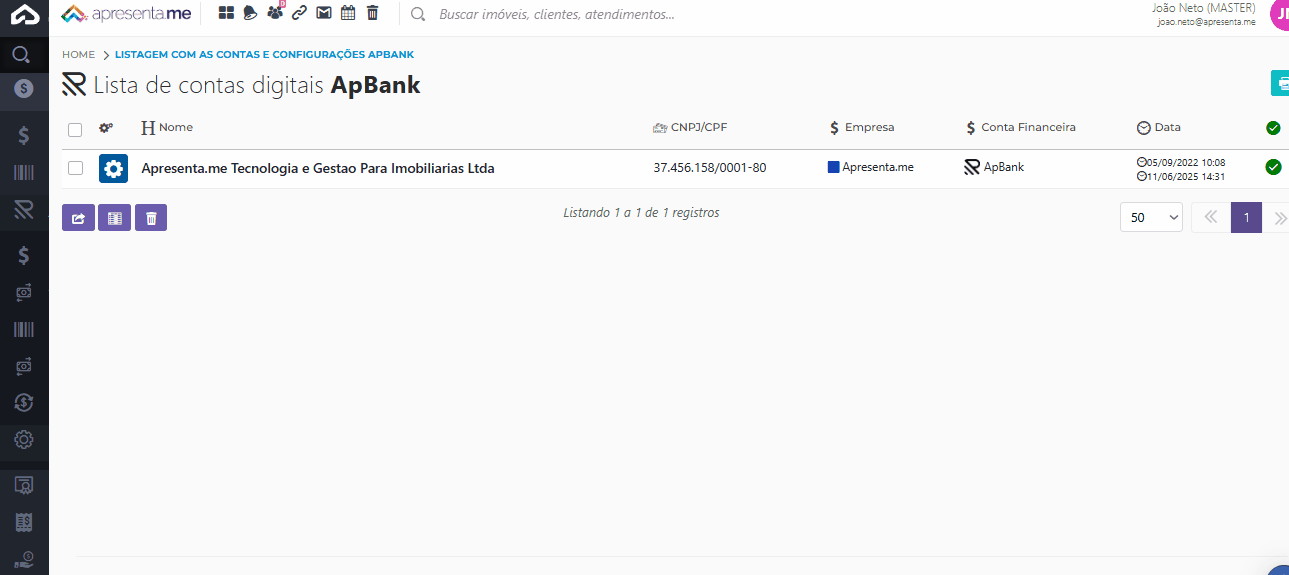 Importante: a Conta ApBank é criada pela equipe da Apresenta.me. O cliente apenas precisa enviar a documentação necessária, e um colaborador Apresenta.me será responsável por realizar a criação da conta. Após isso, basta que você valide a conta no sistema para que ela esteja pronta para uso.