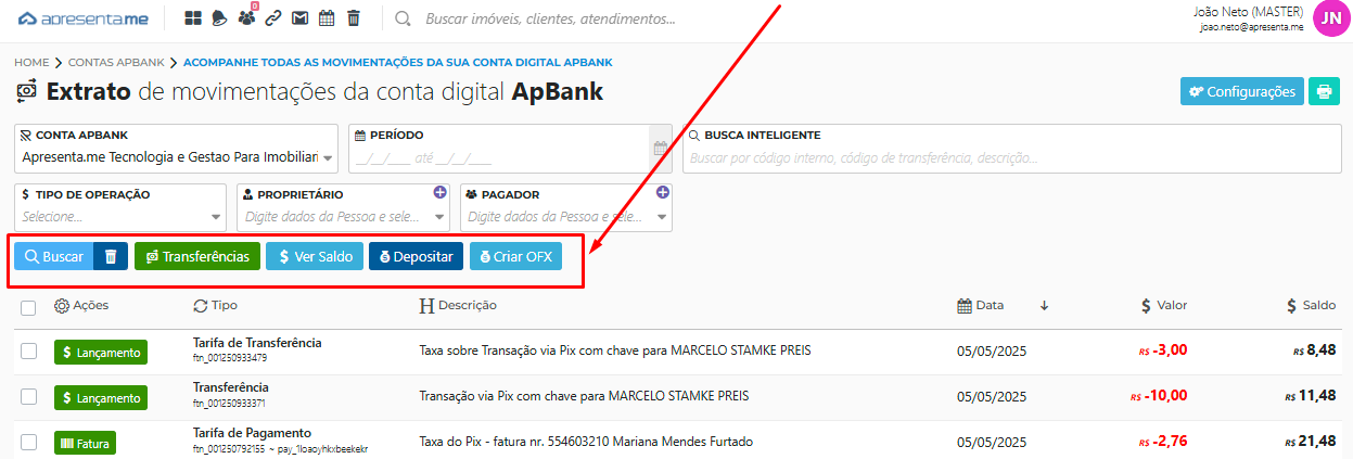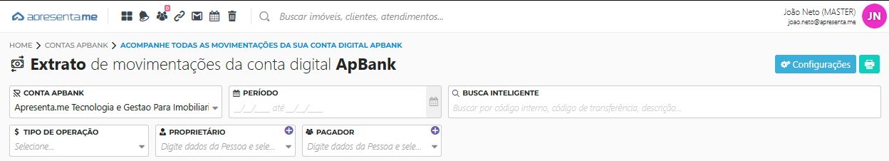 O extrato do ApBank reúne todas as movimentações financeiras realizadas na conta digital da imobiliária.
