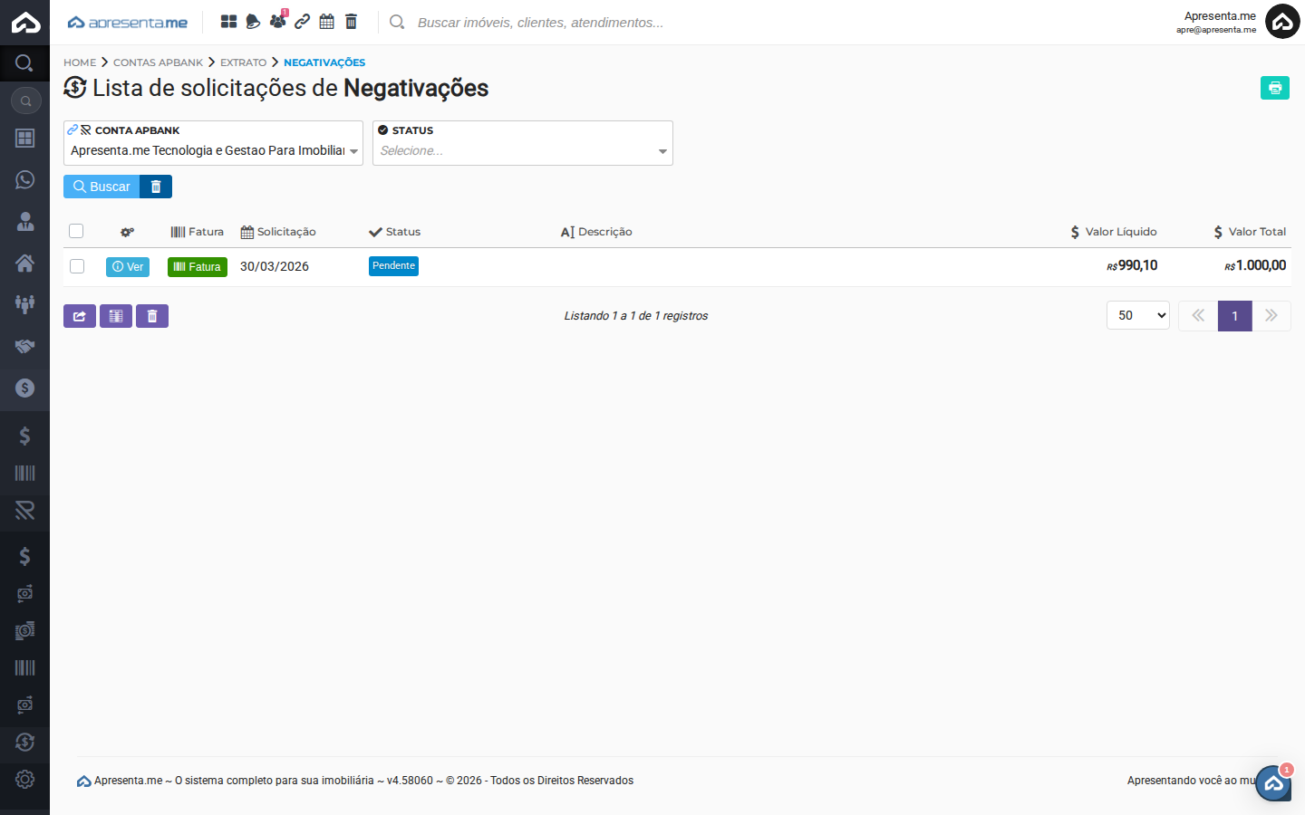 Acesse Financeiro > ApBank - Conta Digital > Negativações de Cobranças. A tela exibirá a listagem de todas as solicitações de negativação registradas.
