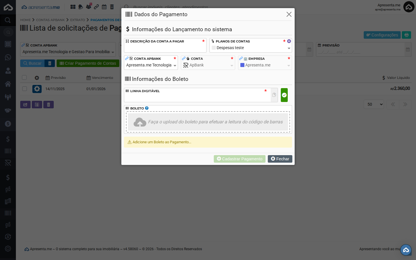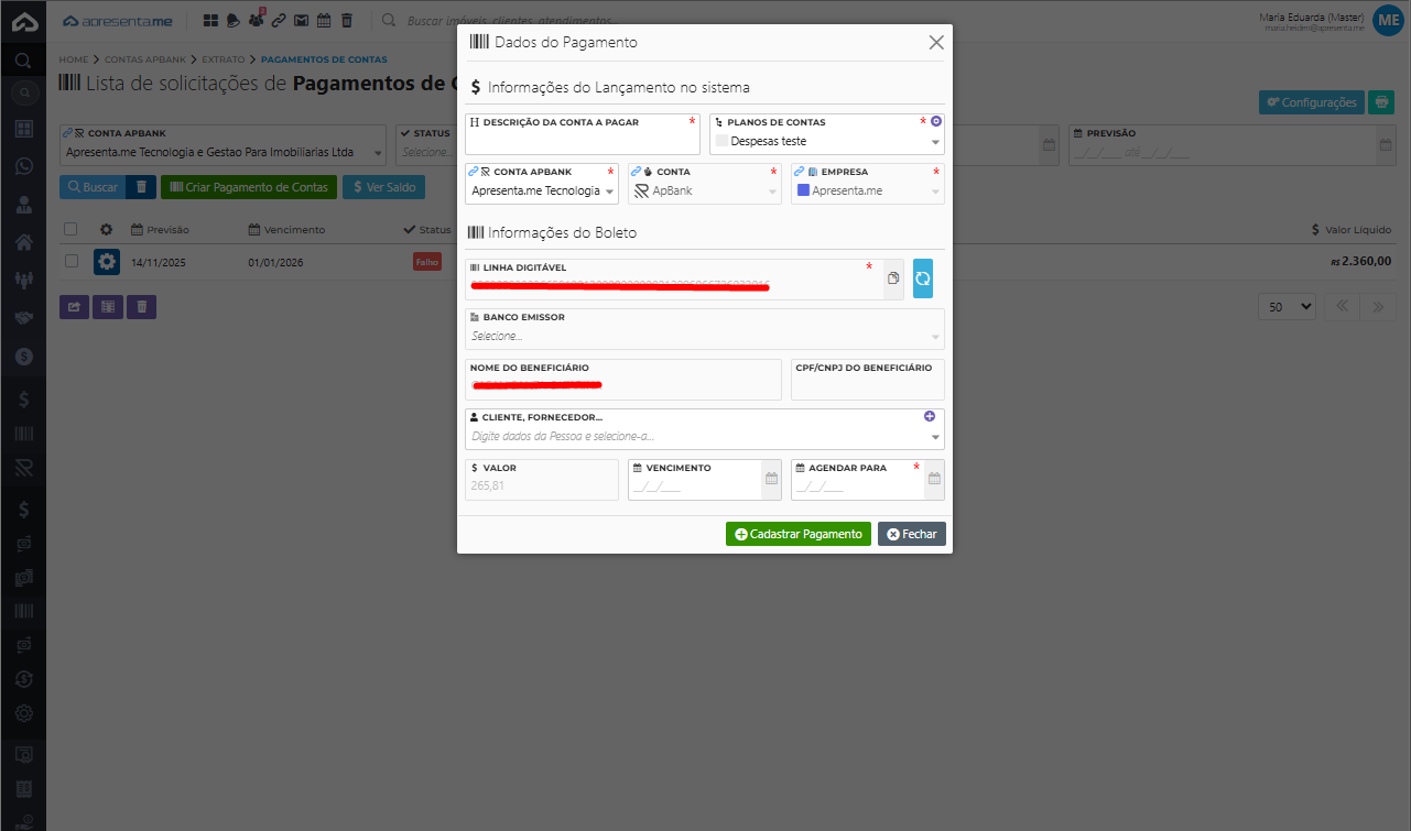 Após preencher todos os campos e validar a linha digitável, clique em Cadastrar Pagamento para registrar e enviar o pagamento. O sistema processará o pagamento junto ao ApBank e o lançamento será criado automaticamente no registro financeiro com os dados informados.