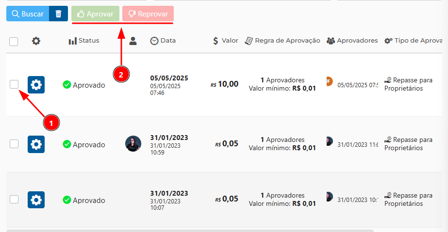 Para tomar a decisão, selecione o item pendente e clique em "Aprovar" ou "Reprovar".