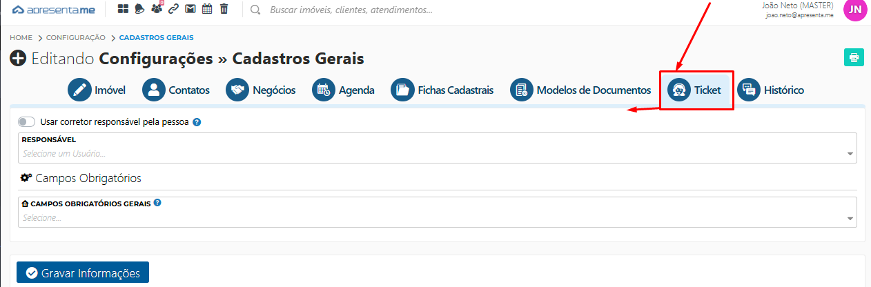 Responsável: Caso não seja usado o corretor responsável, é possível definir um usuário específico como responsável padrão para todos os tickets criados.