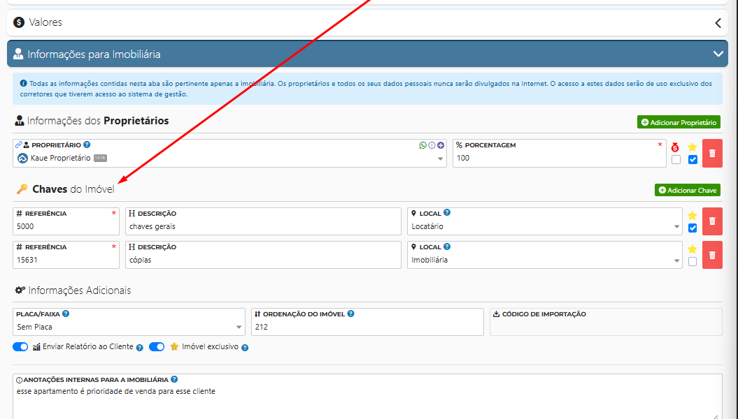 - Principal: quando ativado, indica que essa é a chave principal do imóvel.