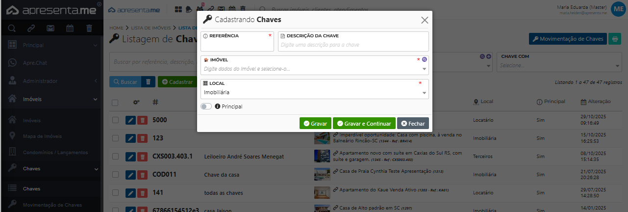 Após preencher as informações necessárias, finalize o processo clicando em Gravar ou Gravar e continuar. A partir desse momento, a chave estará registrada no sistema e vinculada ao imóvel correspondente.