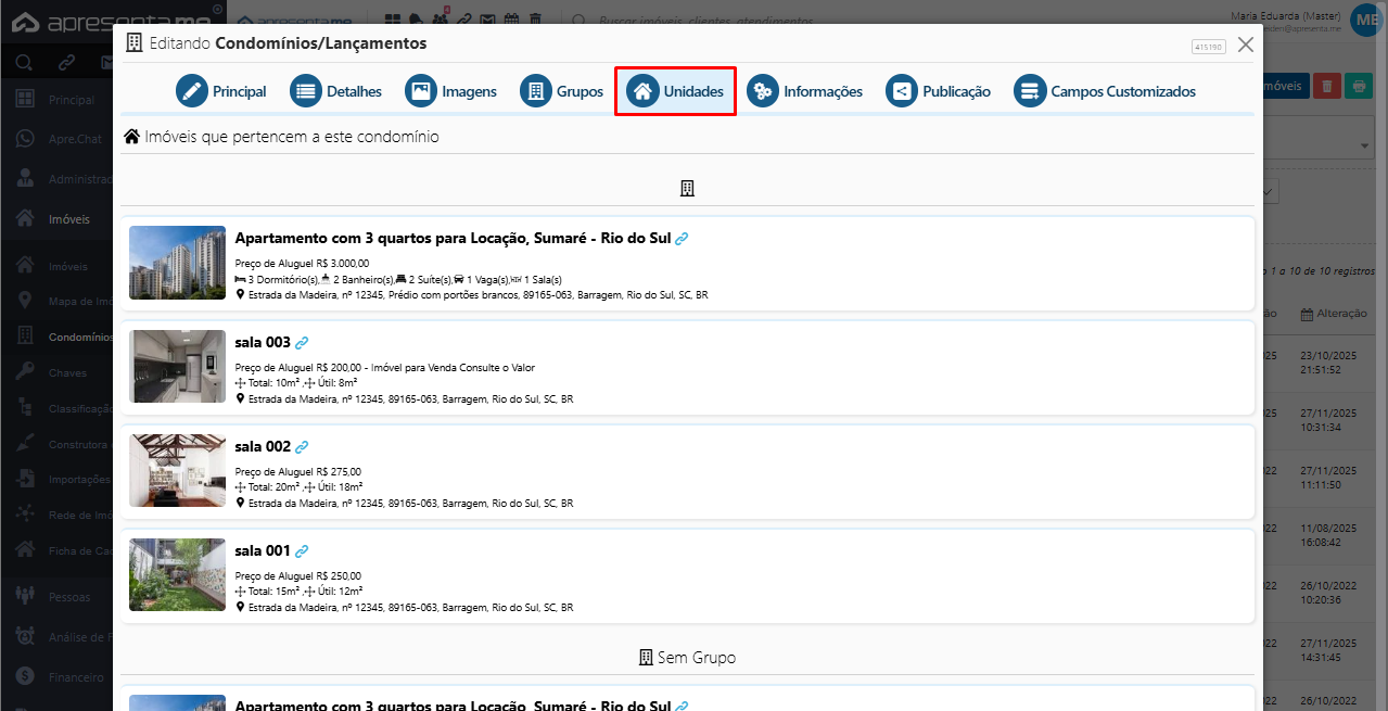 Para confirmar o vínculo, acesse o cadastro do condomínio. Abra o empreendimento desejado e vá até a aba Unidades. O imóvel vinculado aparecerá listado automaticamente, indicando que o relacionamento foi estabelecido com sucesso.