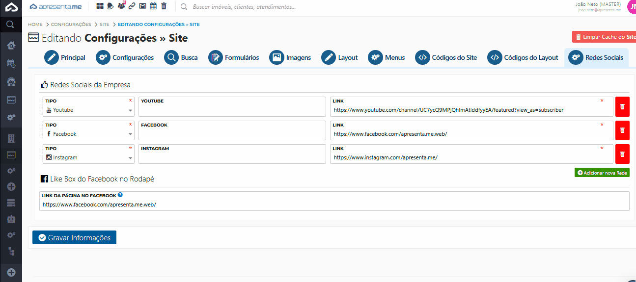 As redes sociais são canais fundamentais para gerar conexão, credibilidade e atrair novos clientes. O sistema permite cadastrar os links das principais redes diretamente no site da sua imobiliária, facilitando o acesso do público.