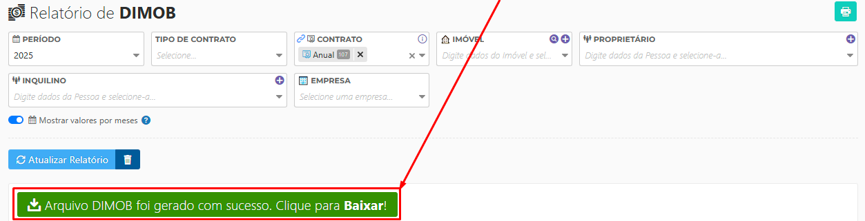 Vale ressaltar que você pode separar o valor por meses, para sua análise basta selecionar a chave "Mostrar Valores por meses"