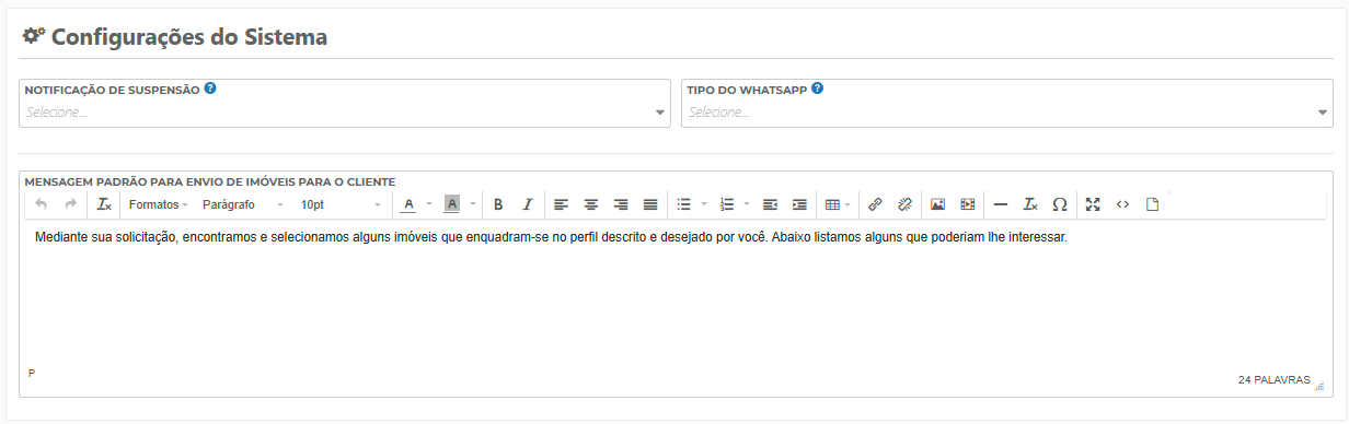 - Mensagem Padrão para Envio de Imóveis: personalize o texto automático que será enviado aos clientes ao compartilhar imóveis.