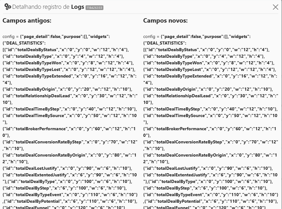 Esses logs mostram exatamente o que foi alterado, comparando o antes e o depois. O sistema salva esse registro em formato técnico, mas a ideia é simples: tudo o que estiver diferente entre as duas colunas é o que realmente mudou. É um histórico para manter segurança, rastreabilidade e transparência.