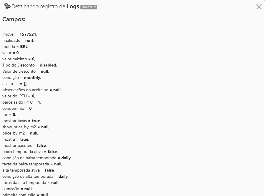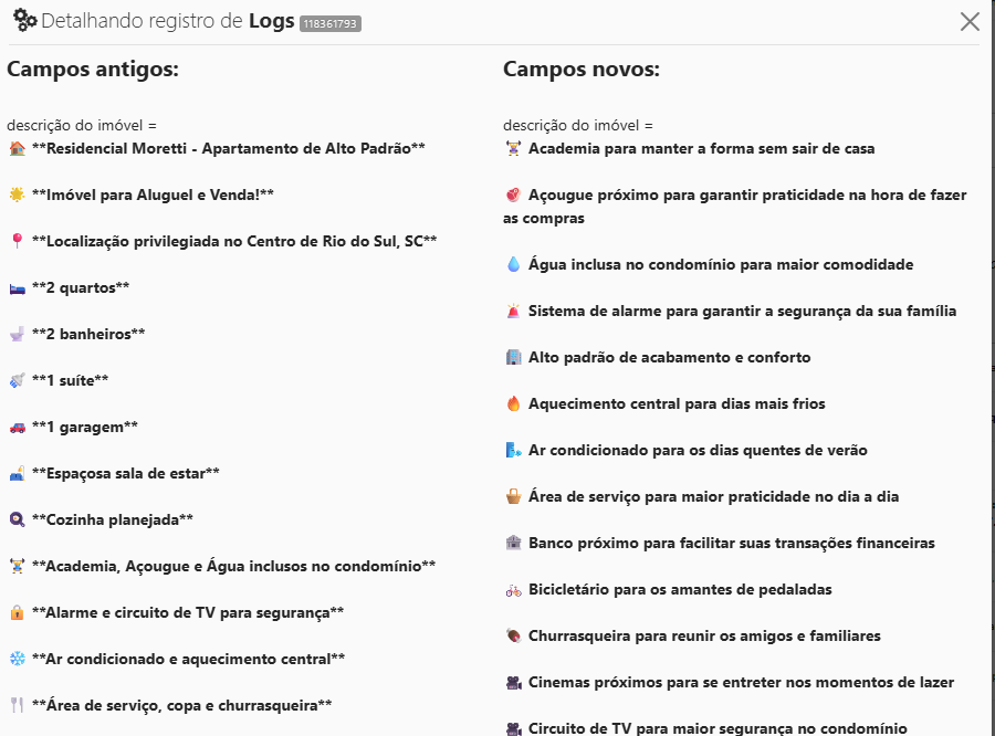 Esses logs mostram exatamente o que foi alterado, comparando o antes e o depois. O sistema salva esse registro em formato técnico, mas a ideia é simples: tudo o que estiver diferente entre as duas colunas é o que realmente mudou. É um histórico para manter segurança, rastreabilidade e transparência.