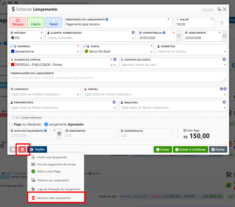 Alternativamente, se estiver visualizando o lançamento em modo expandido, acesse o menu Opções e selecione Excluir lançamento.