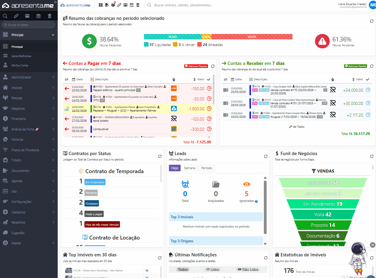 - Busca rápida: pesquise pelo código, nome do proprietário, inquilino ou descrição do lançamento.