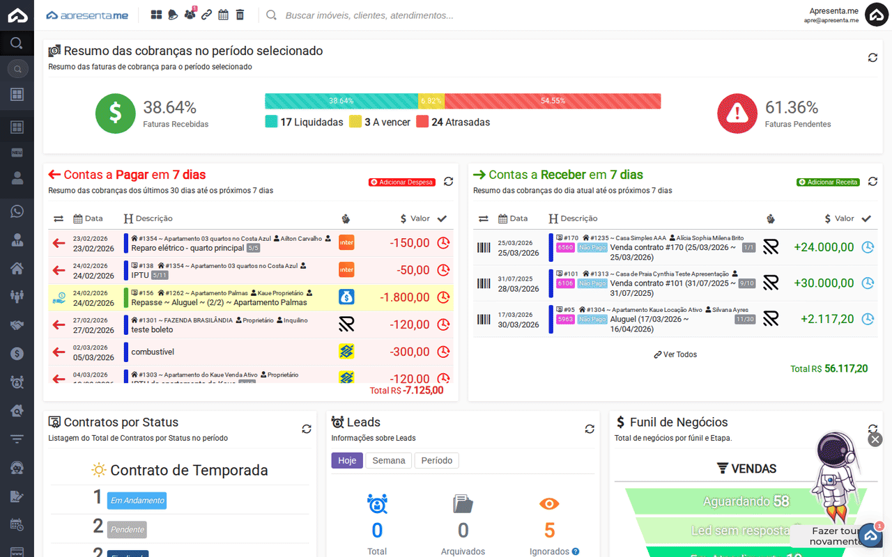 - Busca rápida: pesquise pelo código, nome do proprietário, inquilino ou descrição do lançamento.