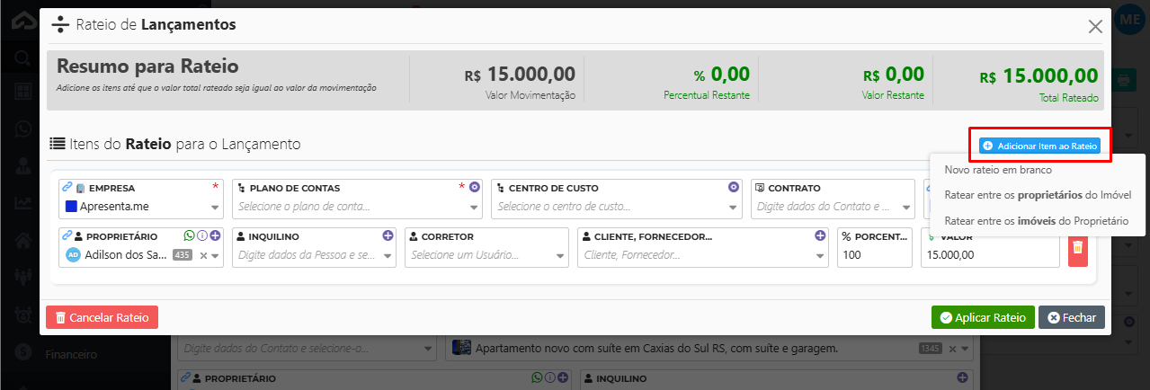 Após configurar o rateio conforme necessário, clique em Aplicar Rateio.