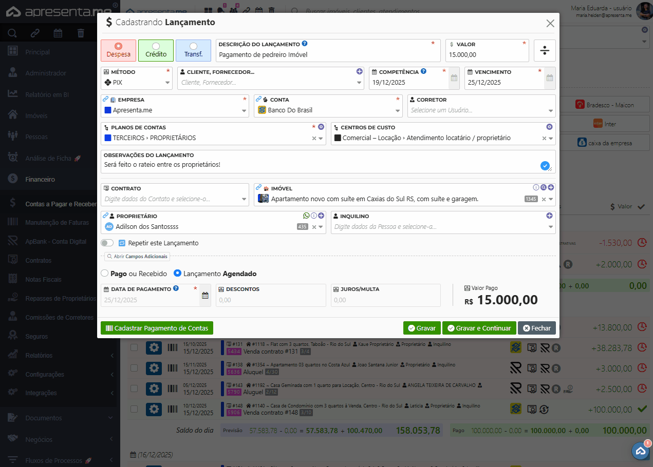 - Ratear entre os proprietários do imóvel: quando o imóvel possui mais de um proprietário, o sistema permite dividir a despesa ou receita entre eles, conforme a proporção definida.