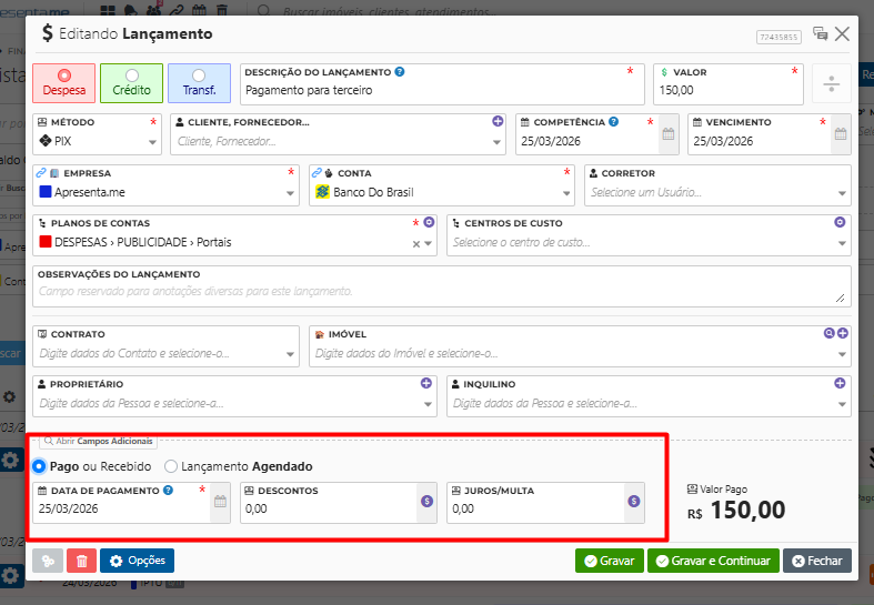 | Valor Pago | Valor efetivamente pago ou recebido. Preenchido automaticamente com o valor do lançamento. | Sim |