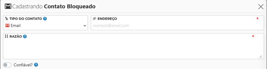 Permite incluir manualmente um contato na lista de bloqueados, ao clicar, trará um novo painel solicitando para preencher a origem (e-mail, whatsapp e Lead).