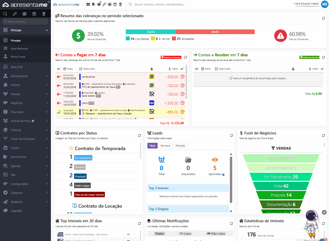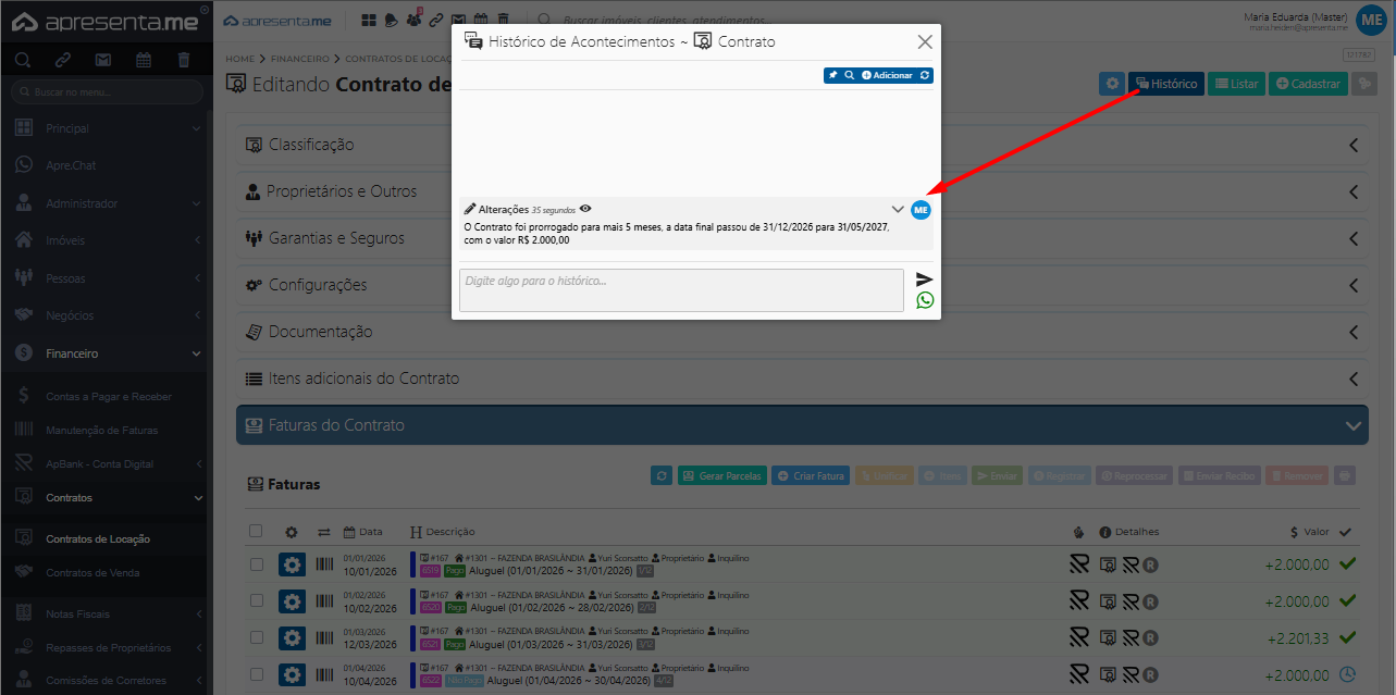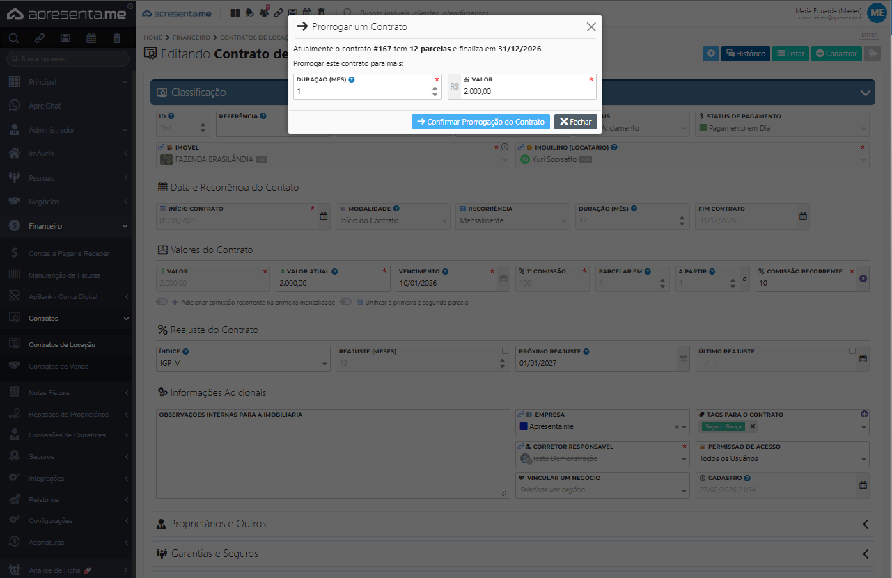 A prorrogação de contrato permite estender a data de término de um contrato de locação ativo, sem precisar criar um novo contrato. Use essa funcionalidade quando o inquilino e o proprietário acordarem em continuar a locação por um período adicional além do prazo original.