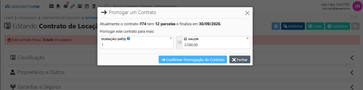 - Clique em Confirmar prorrogação para salvar e aplicar no contrato.