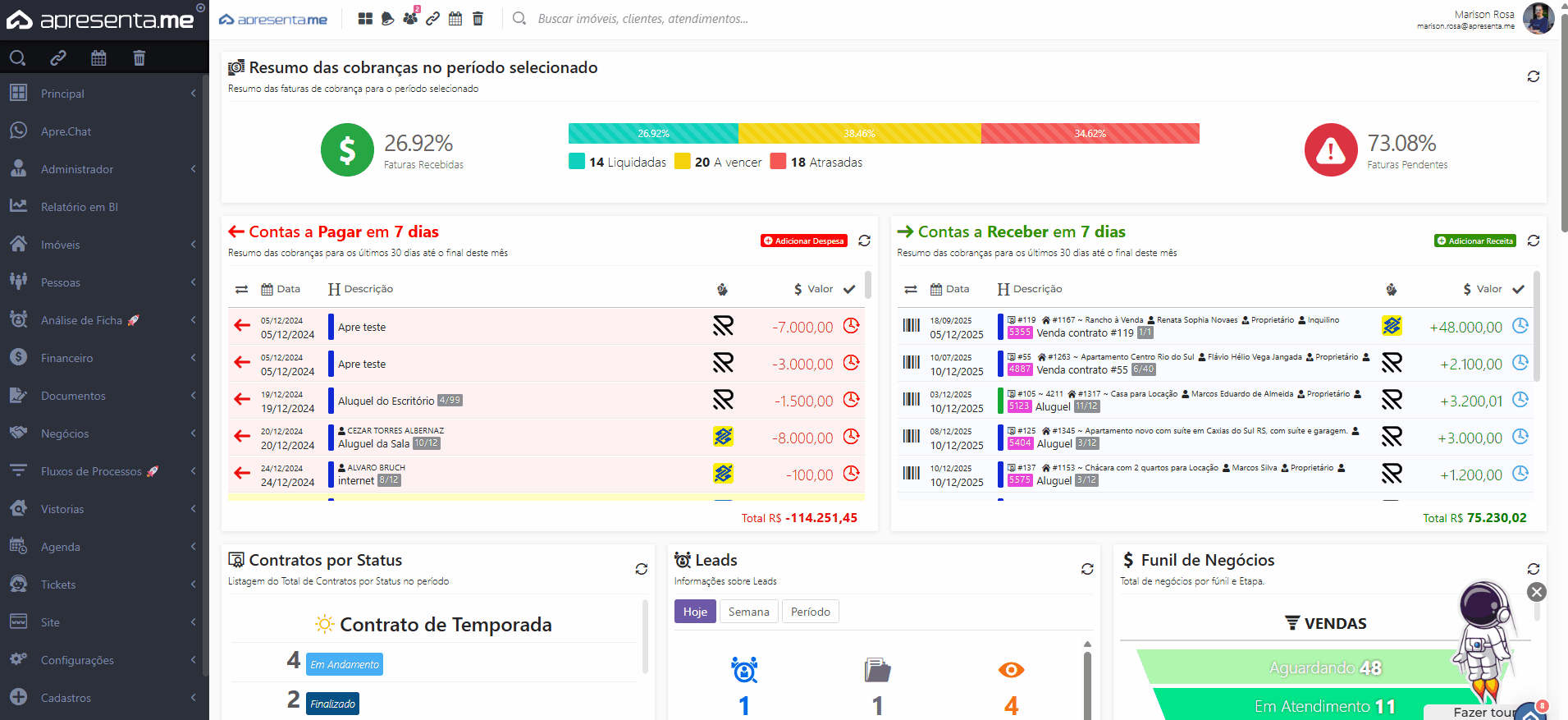 Nessa rotina, é possível visualizar os repasses já criados e, a partir deles, gerar e enviar o recibo correspondente ao proprietário.