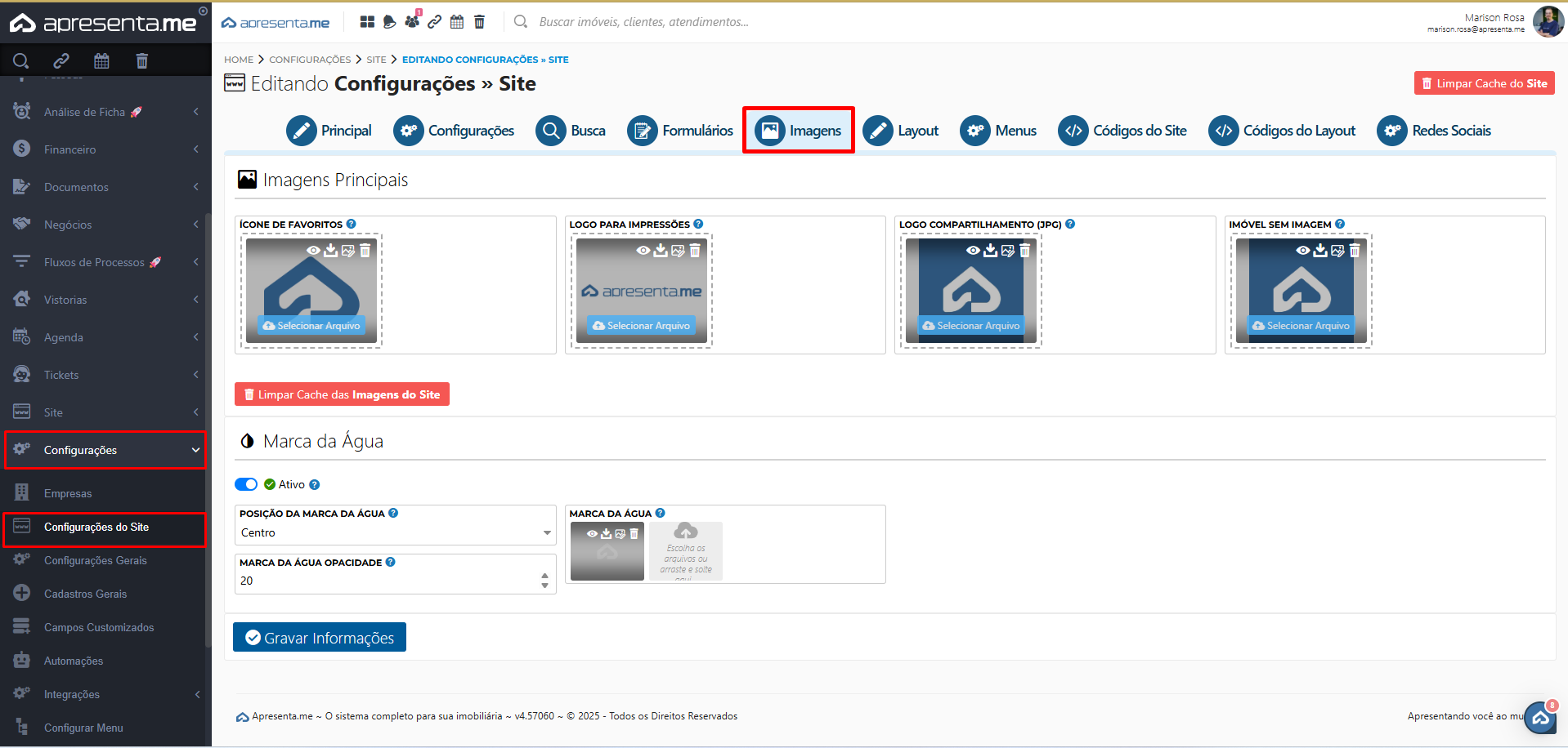 Nessa rotina, é possível alterar a logo exibida no topo e no rodapé do seu site de forma simples e rápida. Você pode atualizar sua identidade visual sempre que necessário, mantendo o site alinhado com a marca da imobiliária.