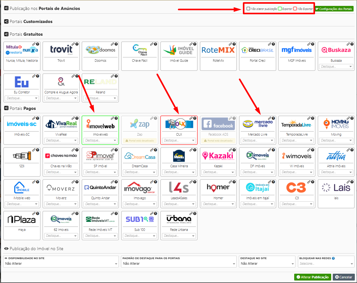 Existem 3 cores que diferenciam o que acontece na exportação do imóvel, quando ao redor do portal ficar verde é que ele vai realizar a exportação, vermelho não vai exportar e ficar sem nenhuma borda não vai acontecer nenhuma ação.