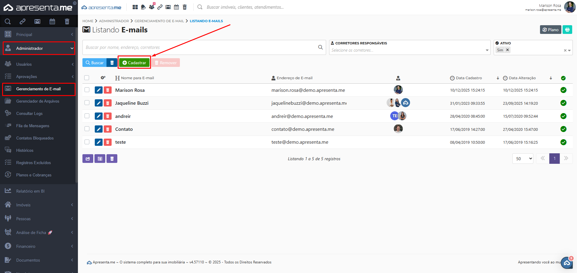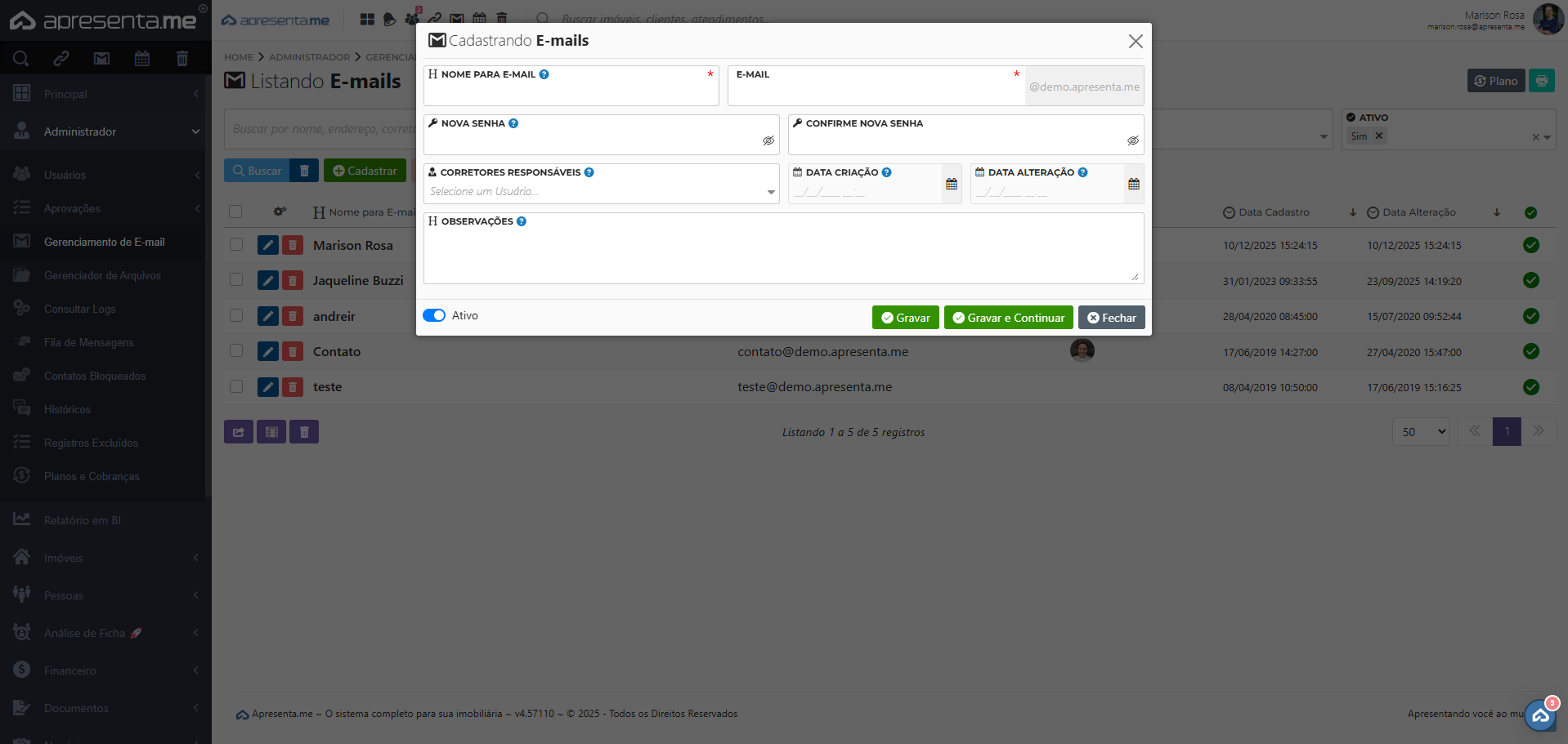 Ao acessar a rotina acima, clique na opção Cadastrar. Em seguida, um anova tela de preenchimento dos dados se abrirá para fazer o novo cadastro de e-mail.