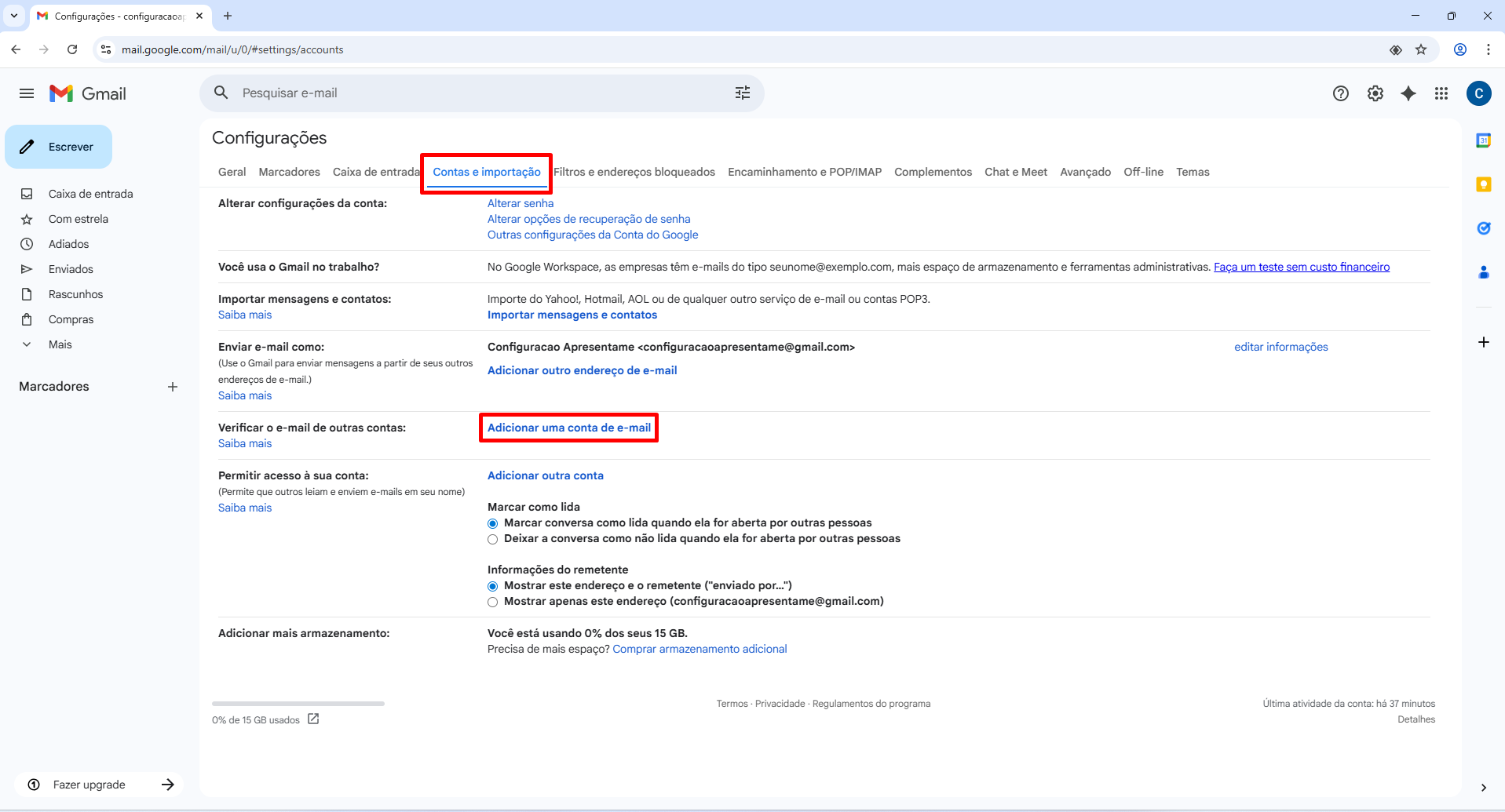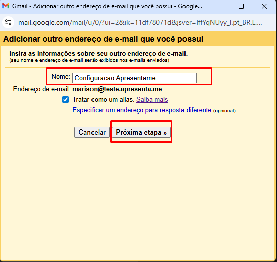 Tratar como um alias: ao ativar, o Gmail entende esse endereço como uma variação do e-mail principal. As mensagens enviadas e recebidas ficam na mesma caixa, facilitando a organização. Recomendado quando o endereço é usado apenas como remetente alternativo e não precisa de separação de contas.