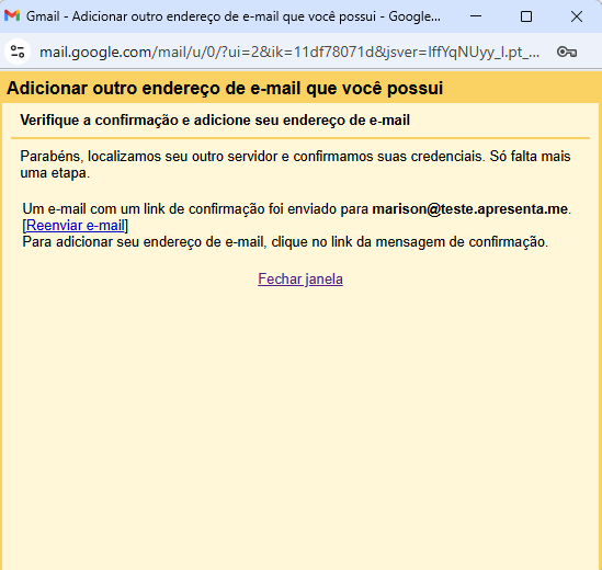 Nessa etapa seu e-mail já está configurado. Se necessário a confirmação como este caso abaixo, basta acessar seu e-mail e confirmar.