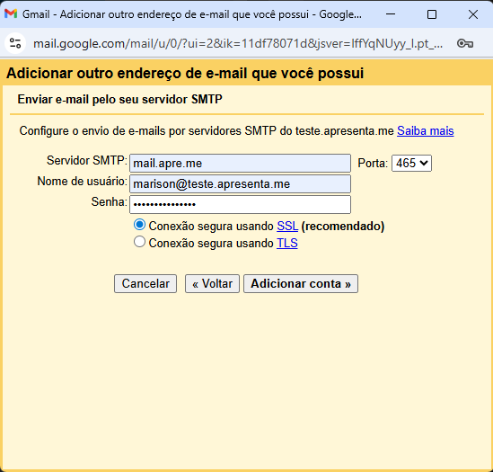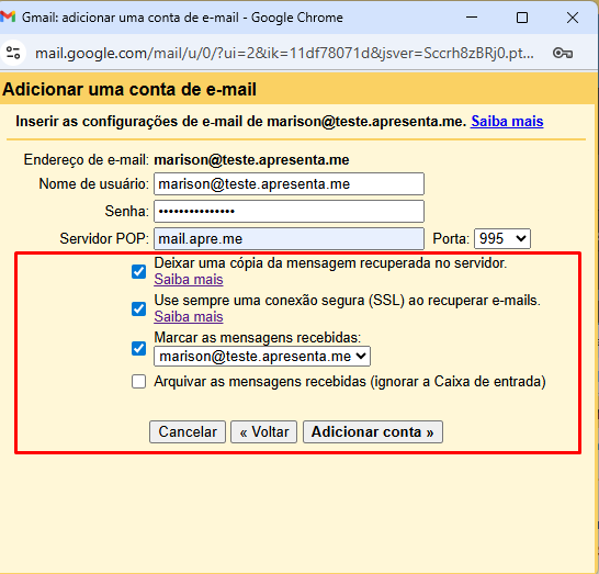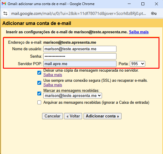 - Servidor POP: Nessa opção você colocará mail.apre.me.