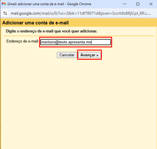 3. Ao selecionar a opção de adicionar uma conta, uma nova aba para a configuração do seu e-mail vai surgir para dar início a integração. Nessa tela, você adiciona o e-mail que vai configurar. Lembrando que após o @, estou utilizando meu domínio. Após isso avança para a próxima etapa.
