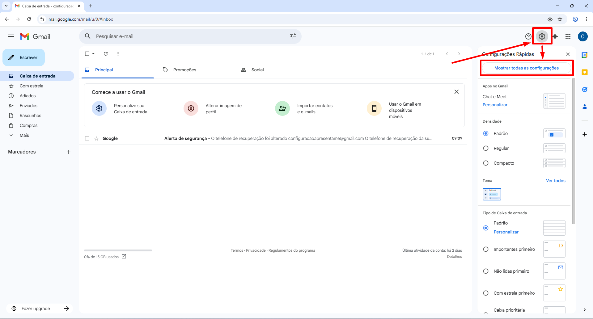 1. Acesse as configurações do Gmail clicando no ícone da engrenagem no canto superior direito da página e selecione Mostrar todas as Configurações.