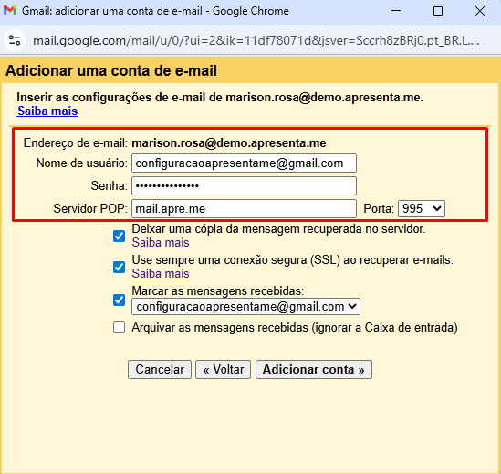 • Servidor POP: Nessa opção você colocará mail.apre.me.