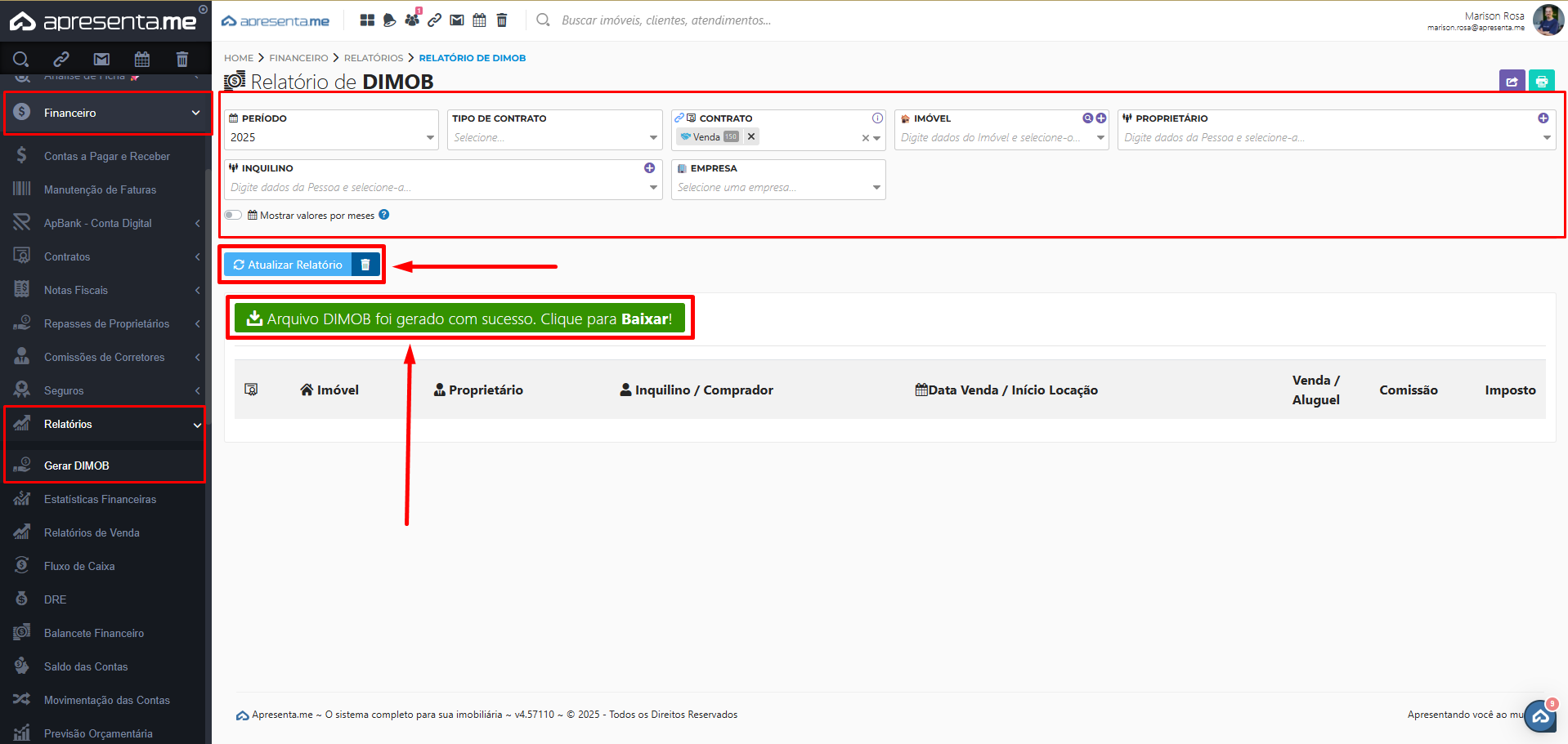 É importante lembrar que o relatório só será gerado e disponibilizado quando a opção DIMOB estiver ativa dentro do contrato. Caso essa opção não esteja habilitada, as informações relacionadas não serão incluídas no relatório.