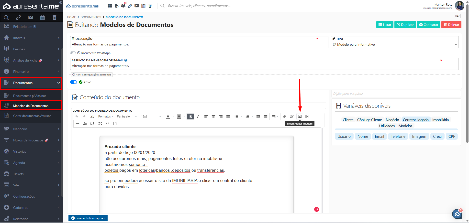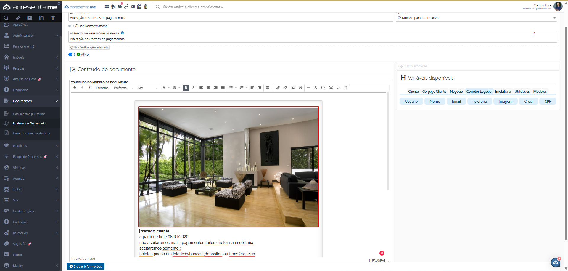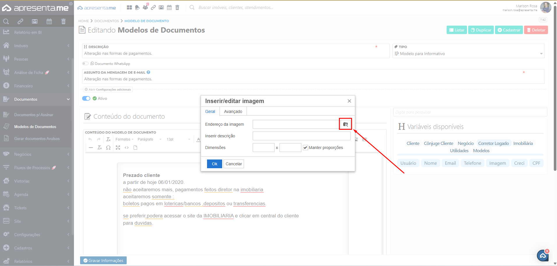 Além das descrições e variáveis que podem ser incluídas nos modelos de documentos, é possível também inserir imagens de forma simples.