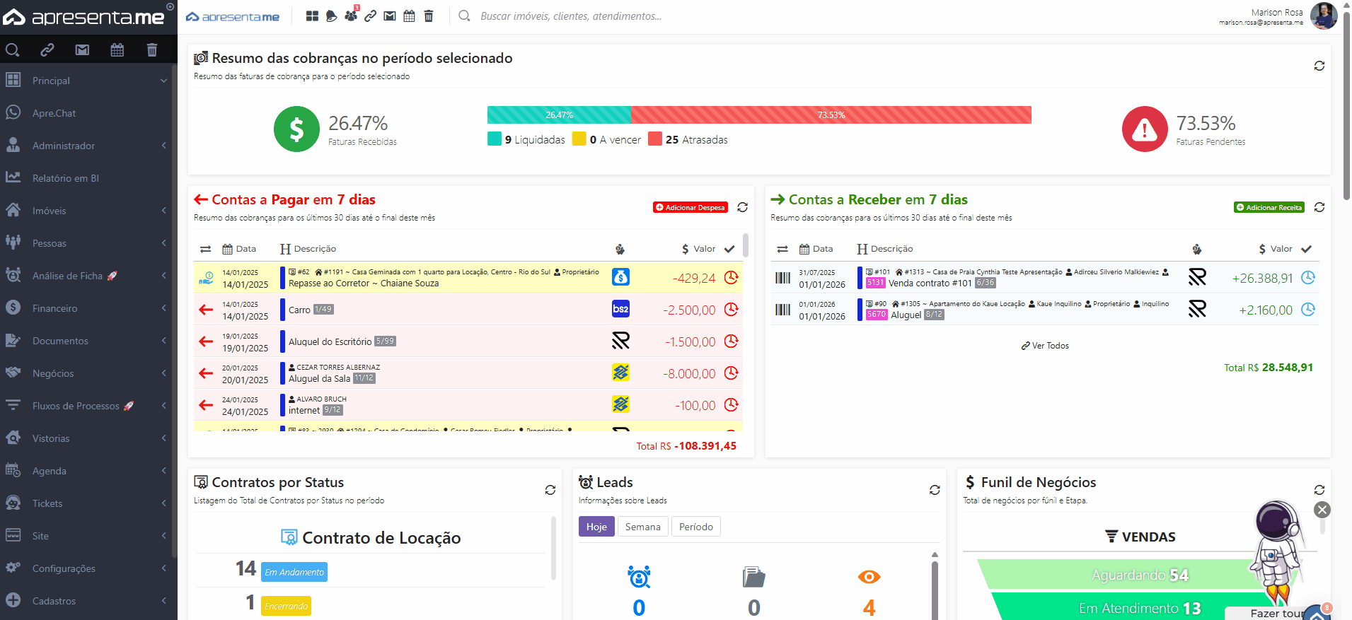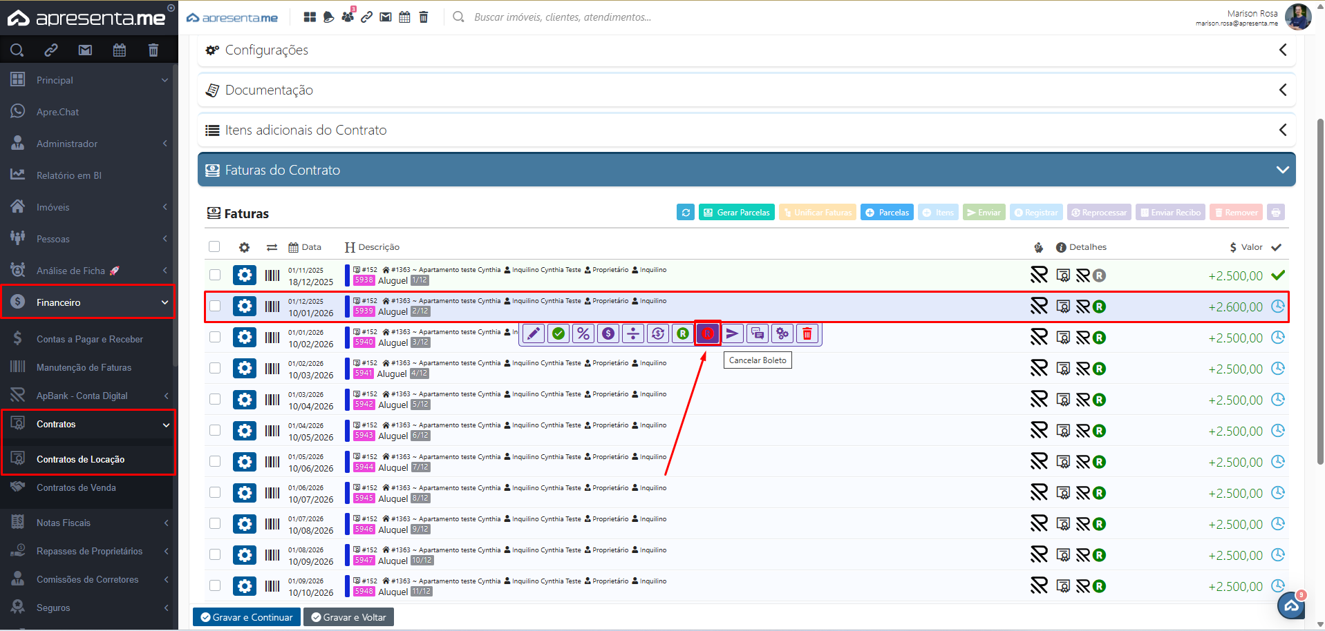 Na aba lateral, acesse a aba Financeiro > Contratos > Contratos de Locação e Faturas do Contrato.