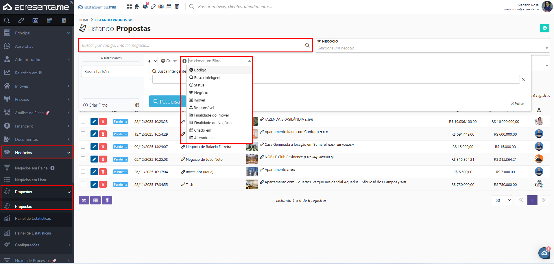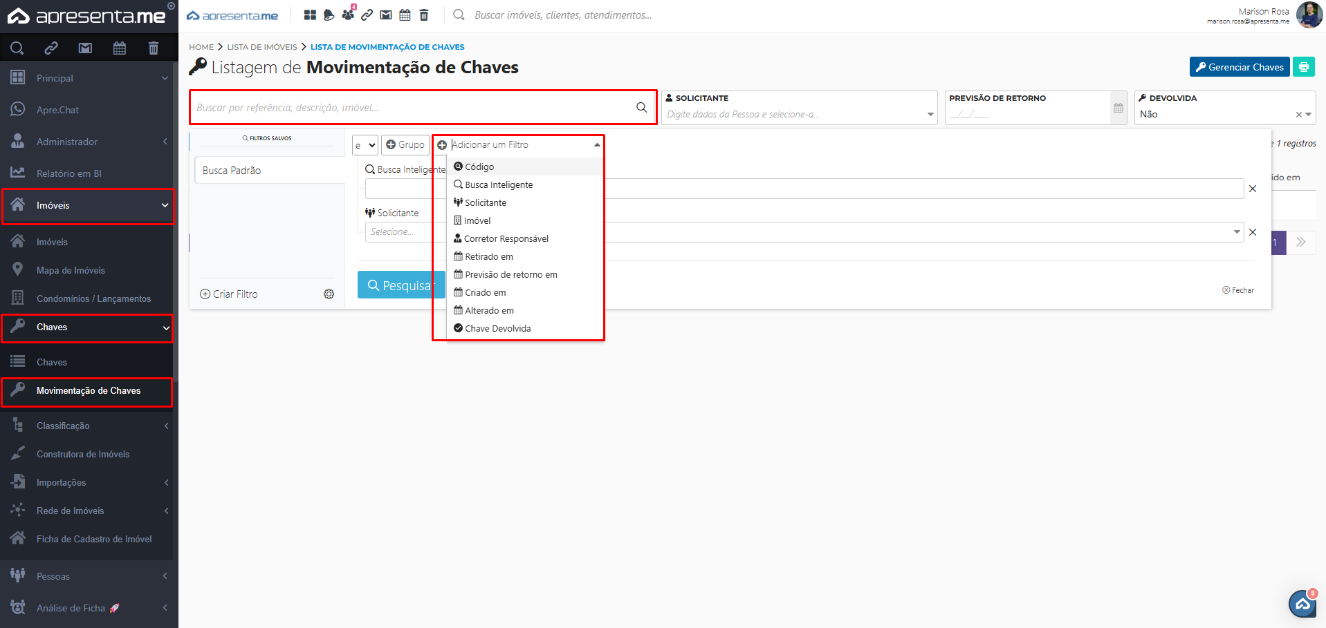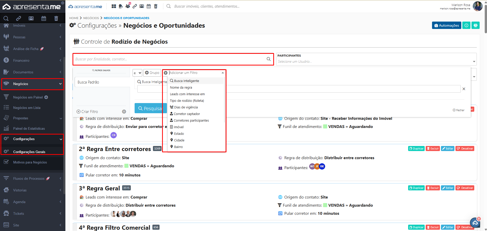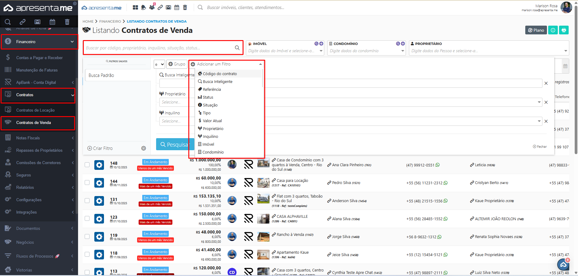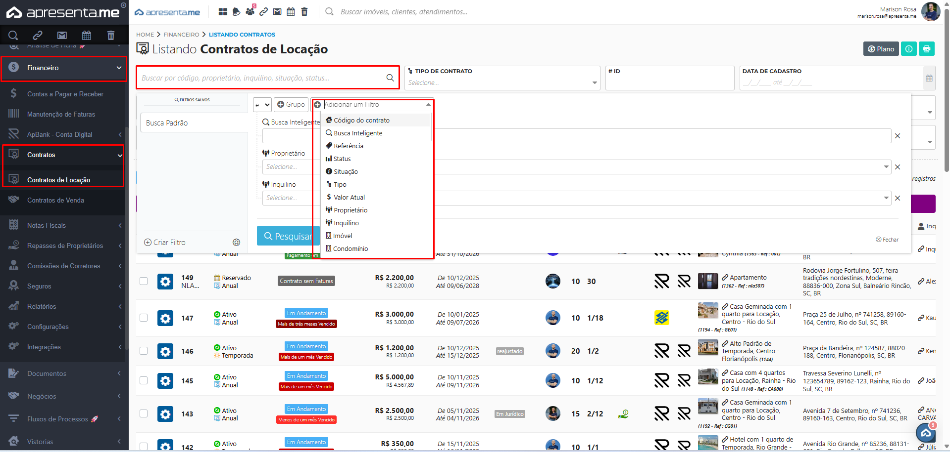 Eles estão disponíveis em diversos módulos, como Imóveis, Pessoas, Contratos, Negócios, entre outros. Cada módulo possui seus próprios critérios de filtro avançado, ajustados à realidade e às informações daquele tipo de cadastro, garantindo uma pesquisa mais precisa e eficiente.