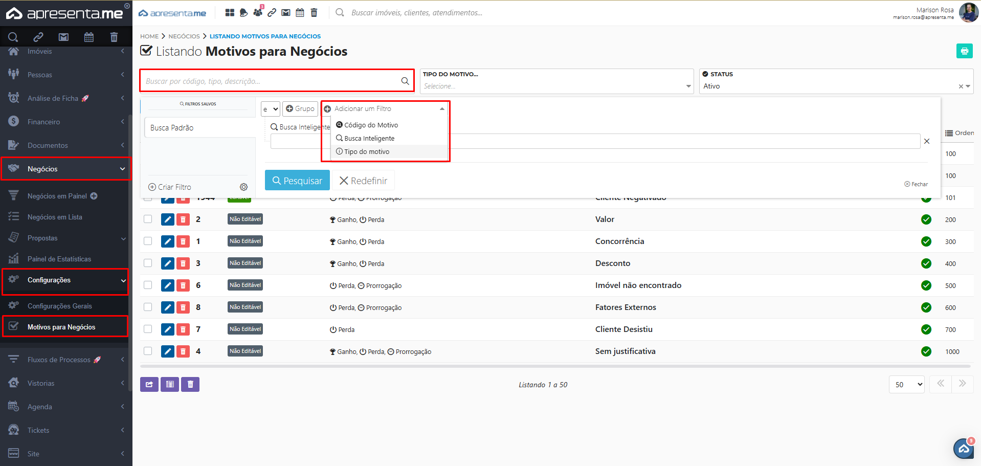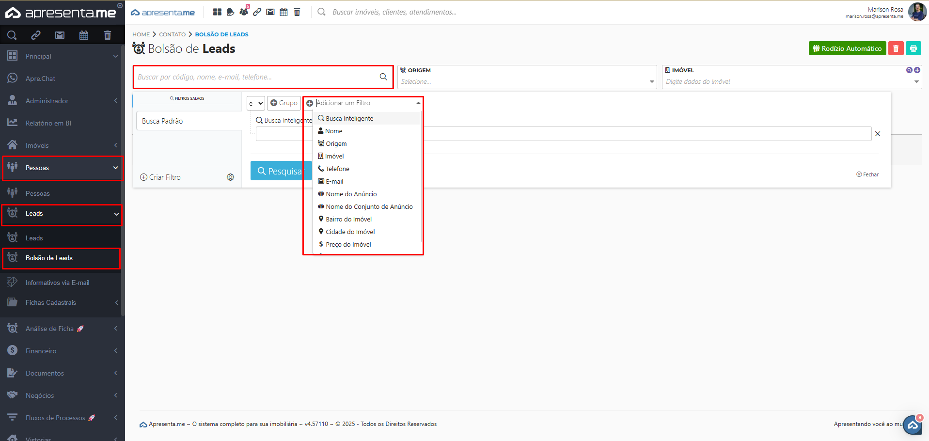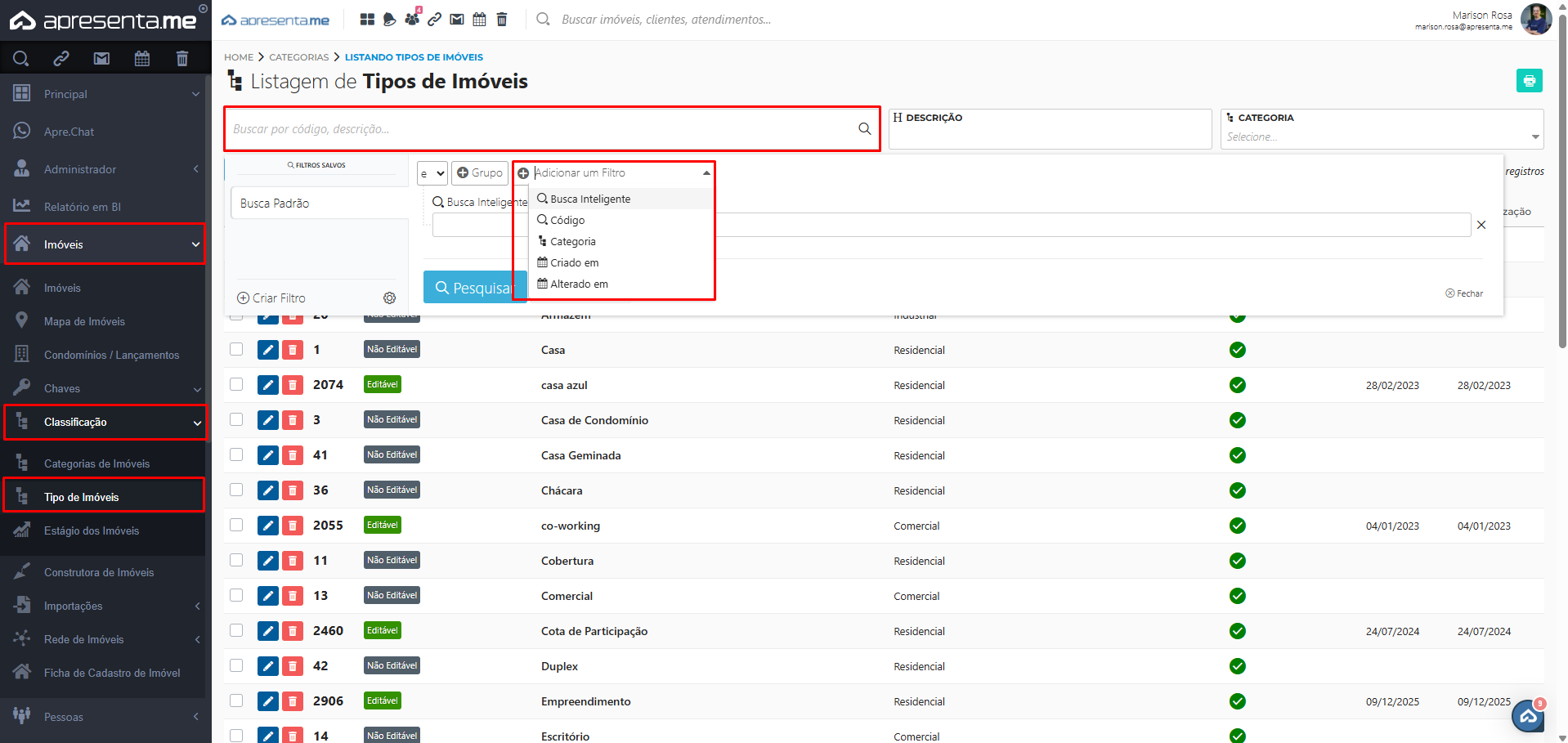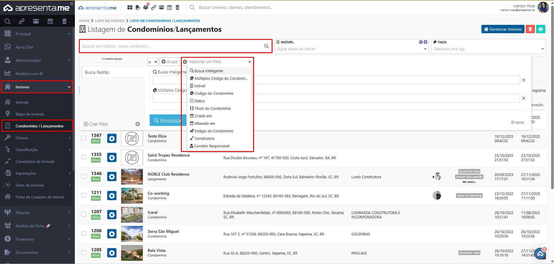 Eles estão disponíveis em diversos módulos, como Imóveis, Pessoas, Contratos, Negócios, entre outros. Cada módulo possui seus próprios critérios de filtro avançado, ajustados à realidade e às informações daquele tipo de cadastro, garantindo uma pesquisa mais precisa e eficiente.