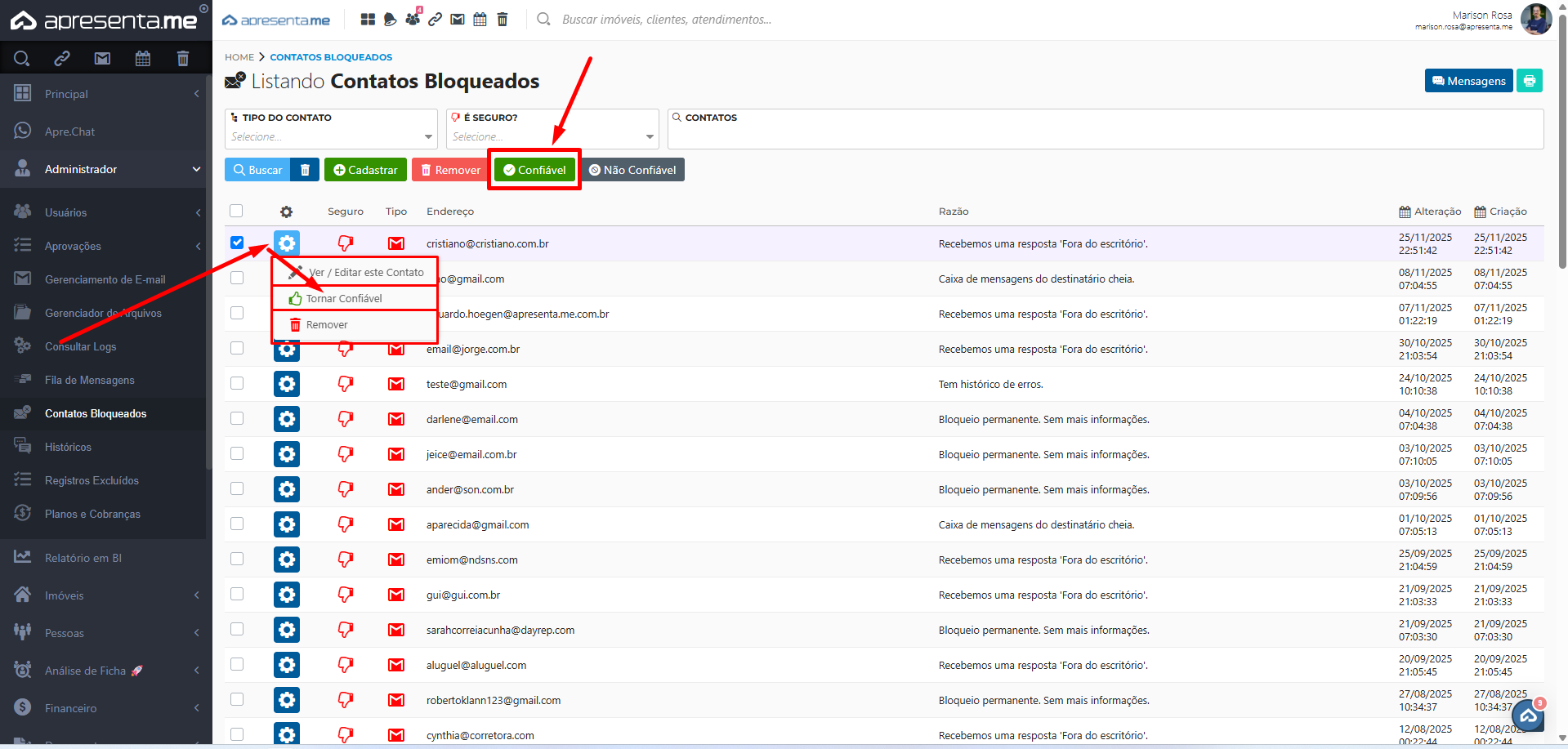 Nessa rotina, é possível visualizar todos os contatos que, por algum motivo, foram bloqueados pelo sistema. Além disso, você pode torná-los confiáveis novamente, liberando o contato para voltar a receber e-mails.