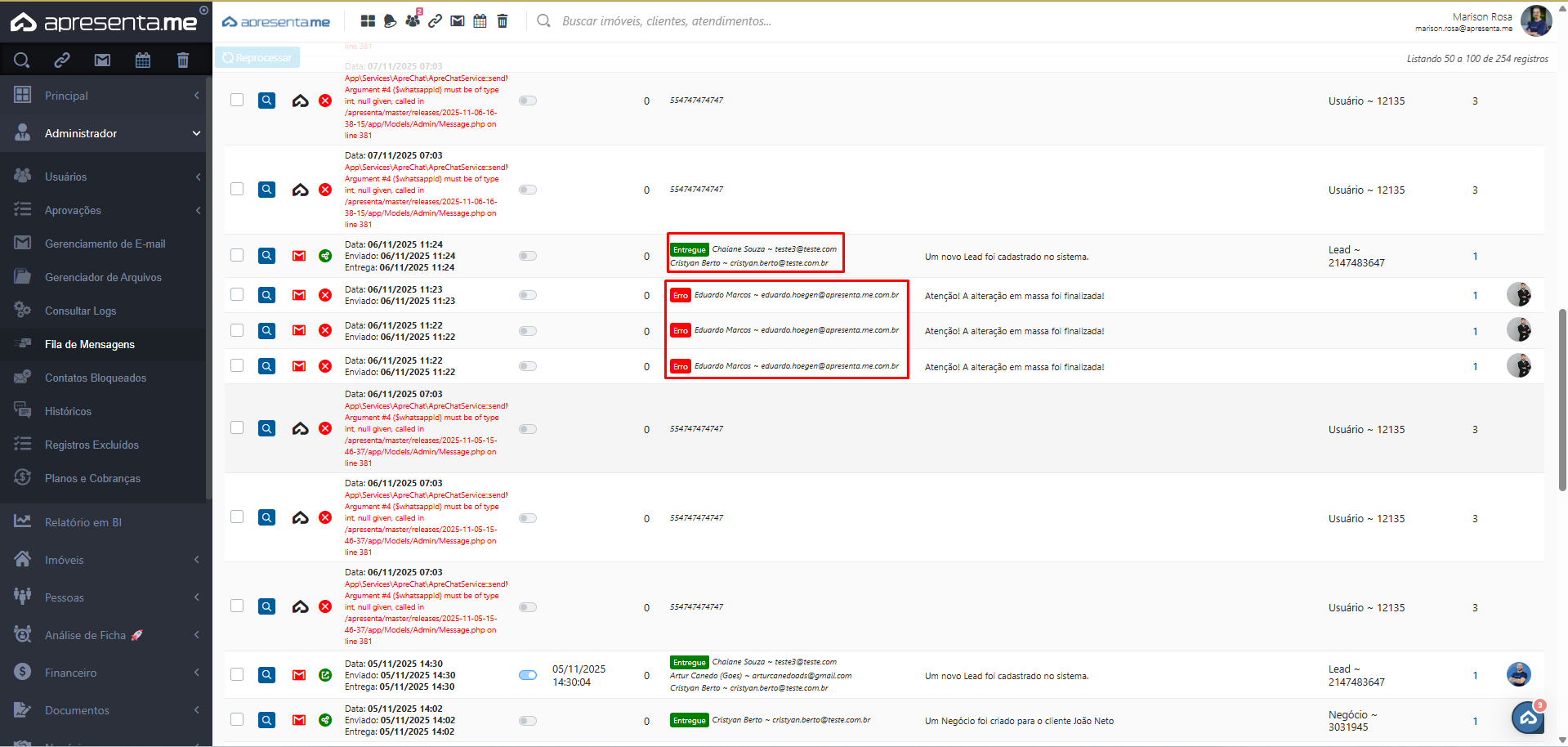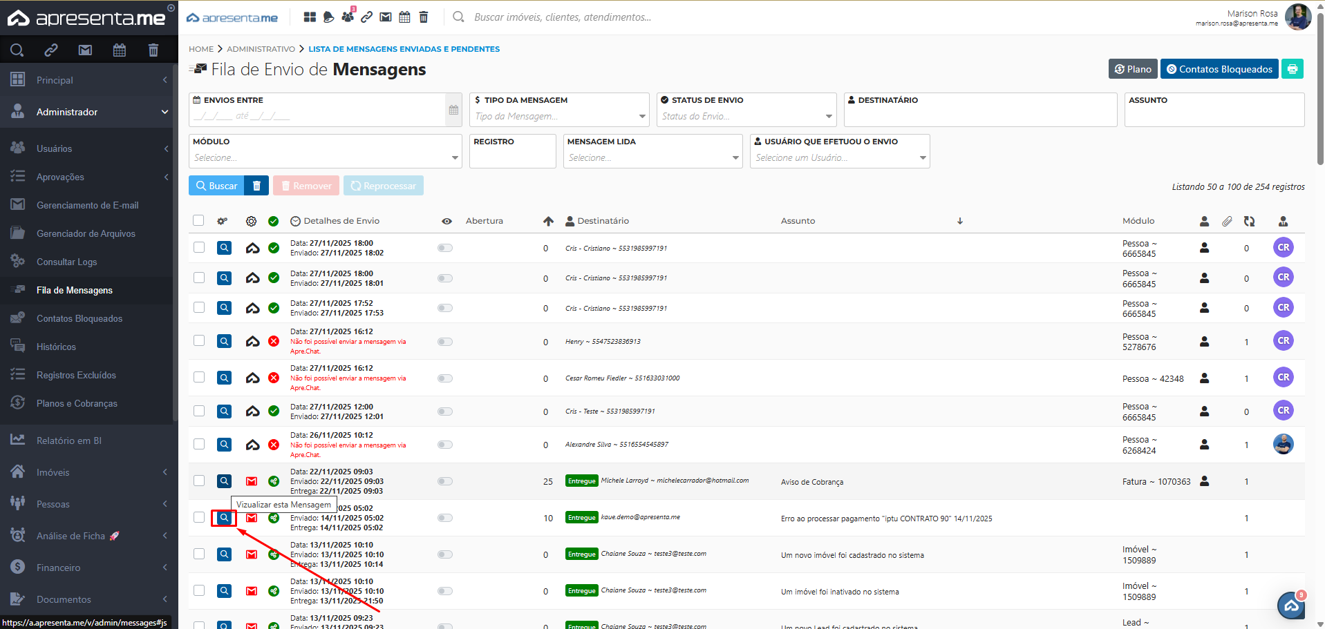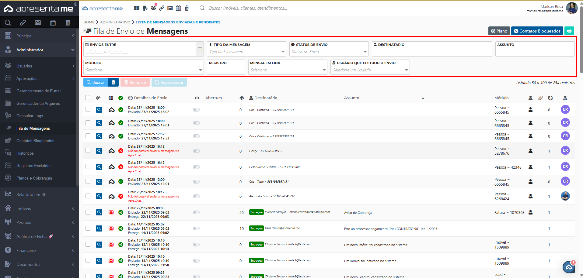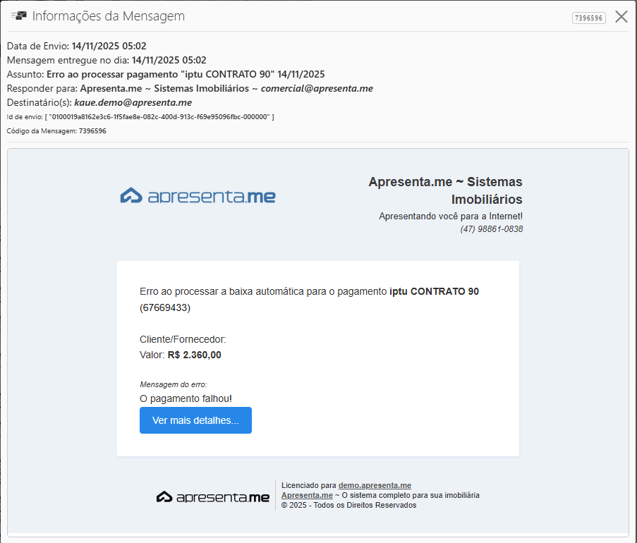Nessa rotina, é possível visualizar tudo o que foi enviado ao cliente, como resumos financeiros, recibos de repasse, informativos e informações de imóveis. Também é possível identificar se a comunicação foi entregue ou se ocorreu algum erro no envio.