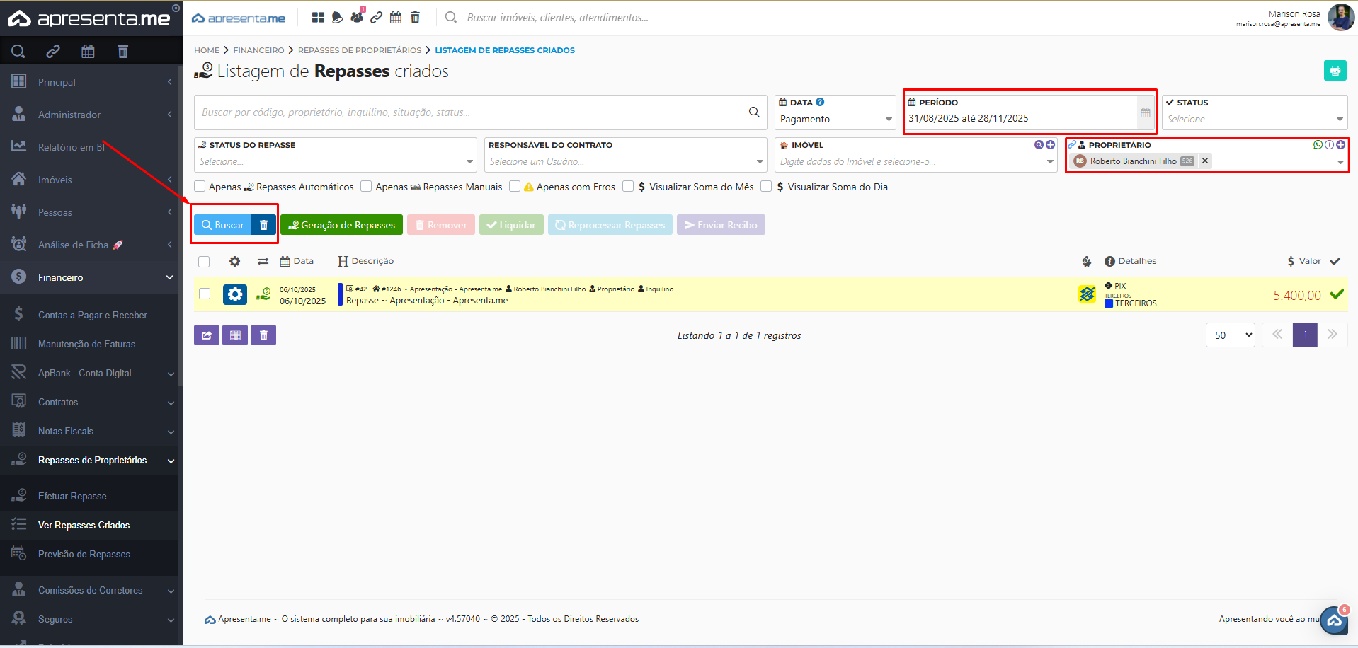 O sistema oferece filtros dinâmicos para facilitar a visualização dos repasses já criados. É possível filtrar por período, imóvel, proprietário, entre outras opções. Esses filtros ajudam a localizar rapidamente repasses específicos conforme a necessidade.