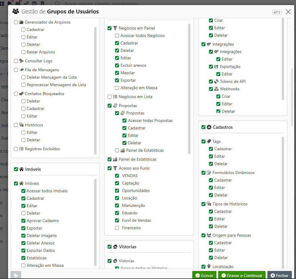 Os grupos Administrador,Corretores - Padrão,API ~ Integrações, e Área do cliente não são possiveis alterar suas permissões.
