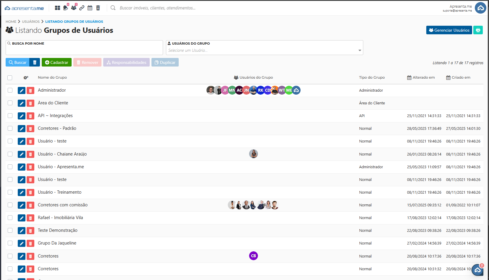 Os grupos Administrador,Corretores - Padrão,API ~ Integrações, e Área do cliente não são possiveis alterar suas permissões.