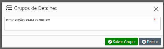 Ao abrir o Gerenciador de Detalhes, será exibida uma listagem com todos os grupos e itens já existentes no sistema. No final dessa listagem, estão disponíveis duas opções principais de criação: