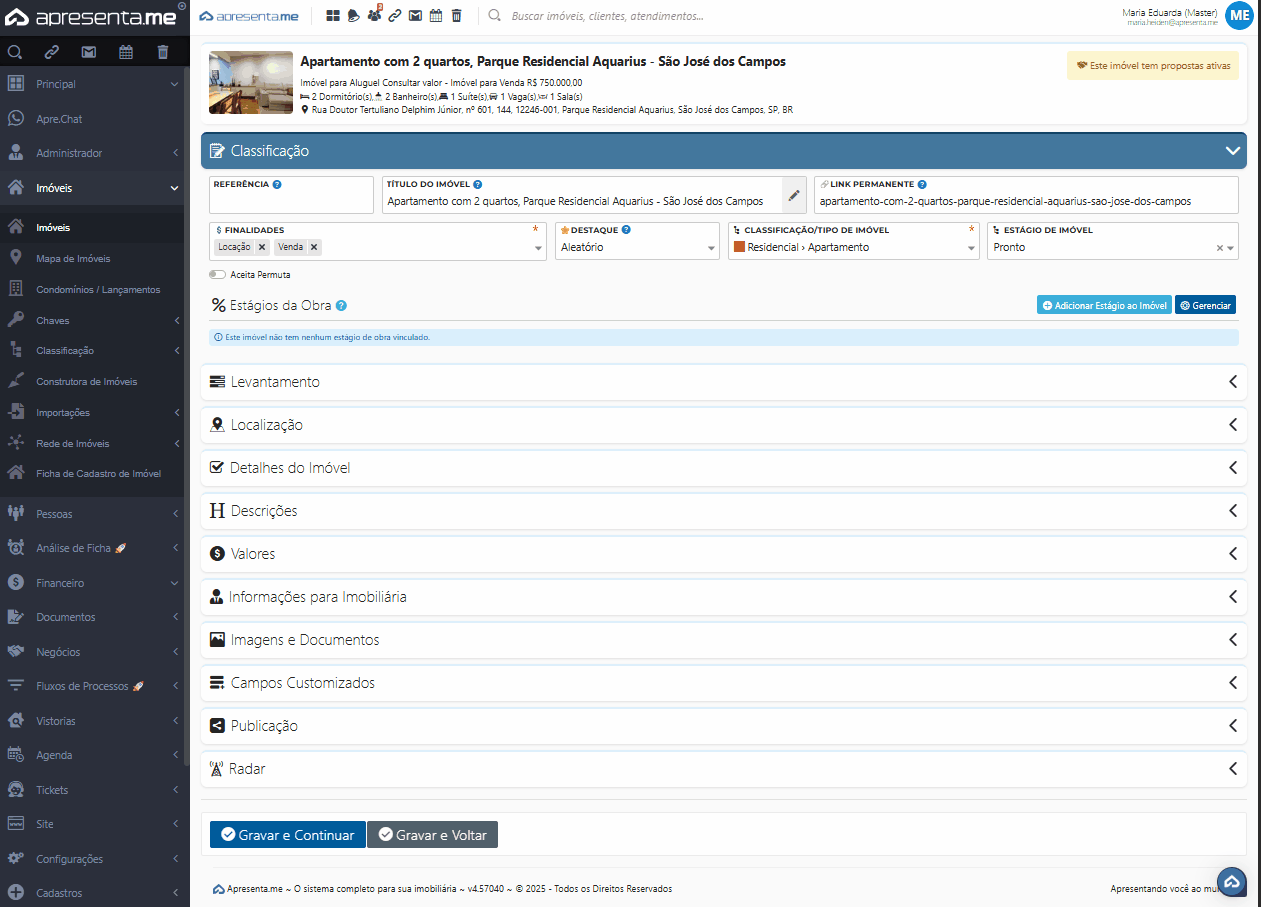 Nesta funcionalidade é possível complementar o cadastro do imóvel adicionando informações específicas sobre suas características e diferenciais. Esses detalhes ajudam a tornar o anúncio mais completo, melhoram as buscas internas e qualificam a apresentação do imóvel no site e nos portais.