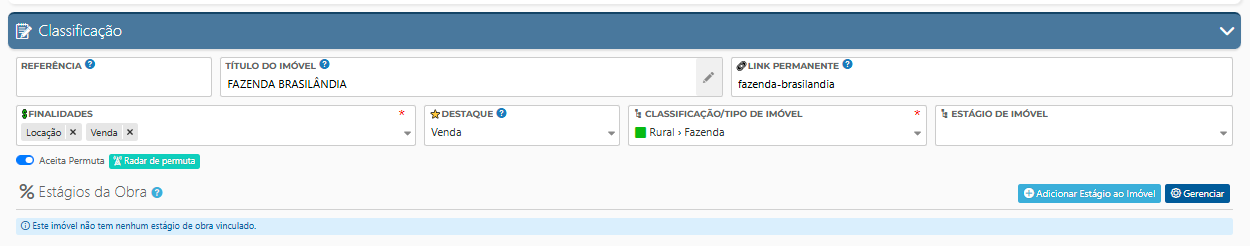 - Estágio de obra: Aonde você pode definir o percentual de obra deste imóvel.