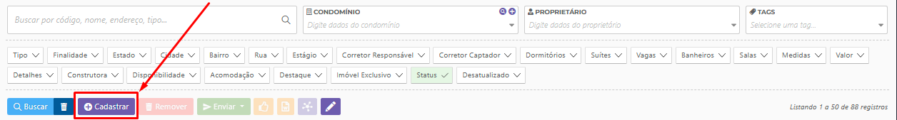 ParaVisualizariniciartodosumosnovoimóveiscadastro,cadastradosacesseem diferentes status (disponível, alugado, vendido, em negociação etc.).- Aplicar filtros de busca por categoria, localização, valor, proprietário e outros critérios.