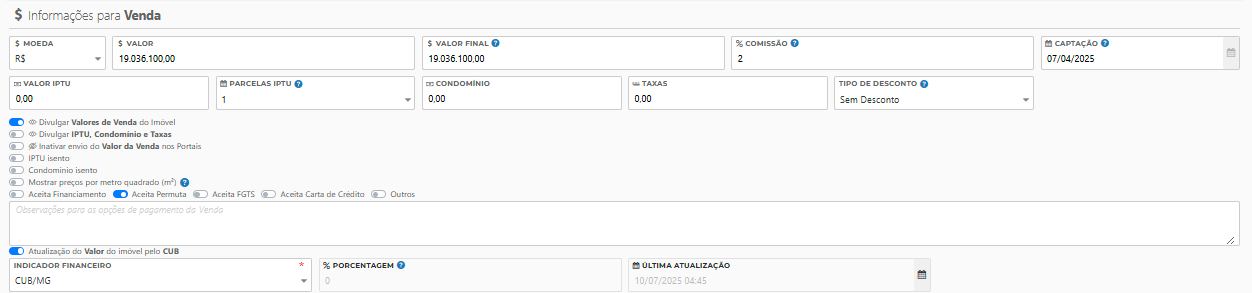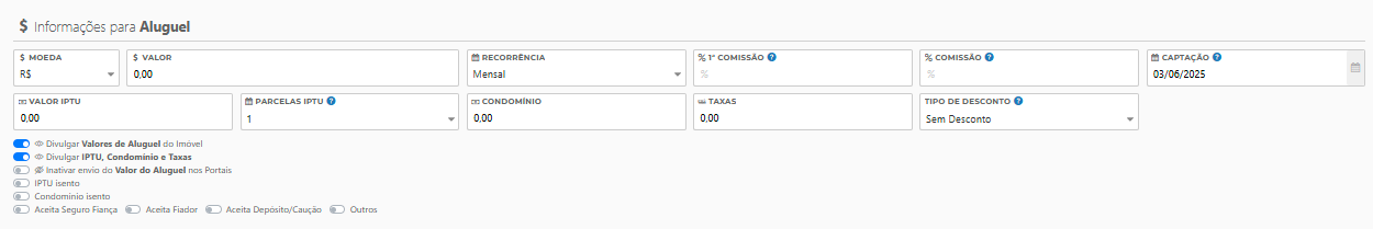 Divulgar Valores de Aluguel do Imóvel: se ativado, exibe o preço do aluguel nos portais.